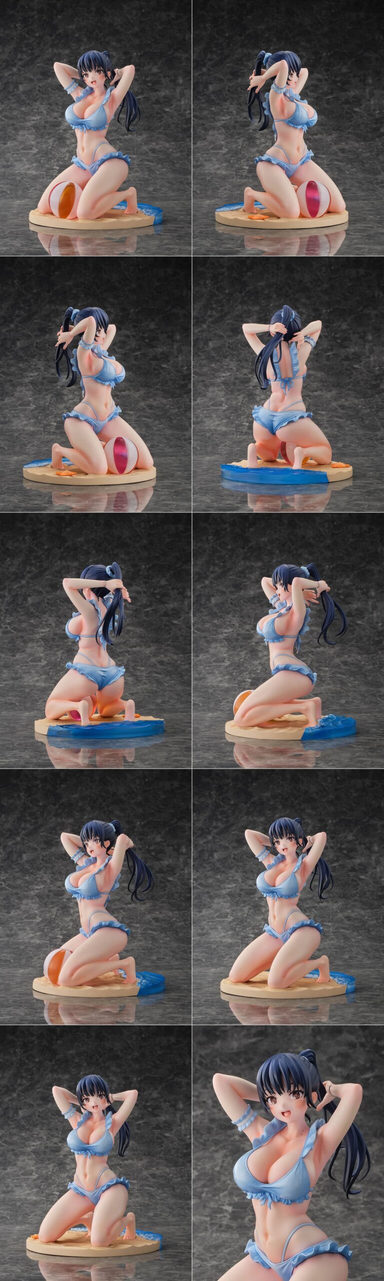 フリルをあしらった鮮やかな艶感のあるパステルブルーの水着が、ビーチではしゃぐ彼女の健康的な美しさを引き立てます。透明感のあるビーチボール、波打ち際を再現した台座など、細部まで質感を追及しました。