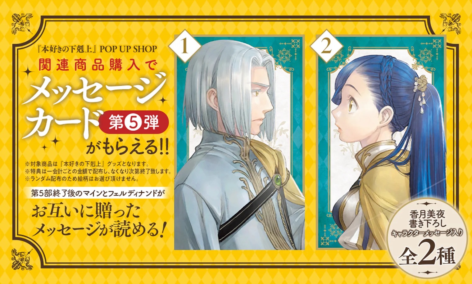 「本好きの下剋上」ポップアップストアにて、グッズをお買い上げ2,200円(税込)ごとに、特典として描き下ろしノベルティー「メッセージカード 第5弾 全2種」をランダムに1枚プレゼント!