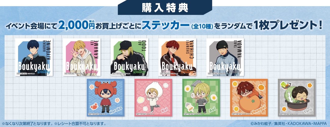 「忘却バッテリー」ポップアップストアにて、グッズをお買い上げ2,000円(税込)毎に特典として「ステッカー 全10種」がランダムに1枚プレゼントされる。