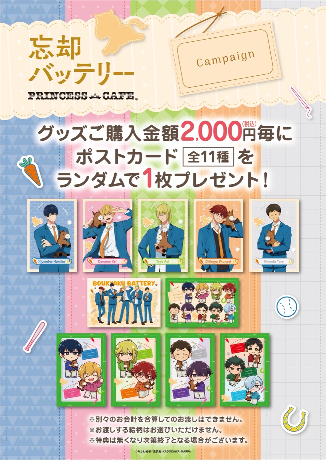 さらに、「忘却バッテリー」関連商品を含めて、2,000円(税込)お買い上げ毎に特典として「ポストカード (全11種)」をランダムに1枚プレゼント!