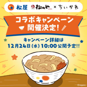 不器用ながらも何事も一生懸命頑張って仲間と強く生きている姿が尊い「ちいかわ (なんか小さくてかわいいやつ)」× 松屋・松のやによるコラボキャンペーンが実施決定!これは、松屋の公式Xアカウントにて2025年12月19日投稿された情報。企画詳細は12月24日10時公開を予定されている。