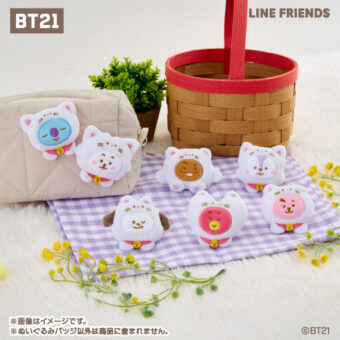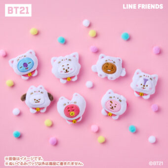 「BT21 × ファミマ」コラボでは、KOYA・RJ・SHOOKY・MANG・CHIMMY・TATA・COOKYらがネコ姿となった「BT21 ぬいぐるみバッジ」が発売される
