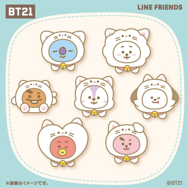 「BT21 × ファミマ」コラボでは、KOYA・RJ・SHOOKY・MANG・CHIMMY・TATA・COOKYらがネコ姿となった「BT21 ぬいぐるみバッジ」が発売される
