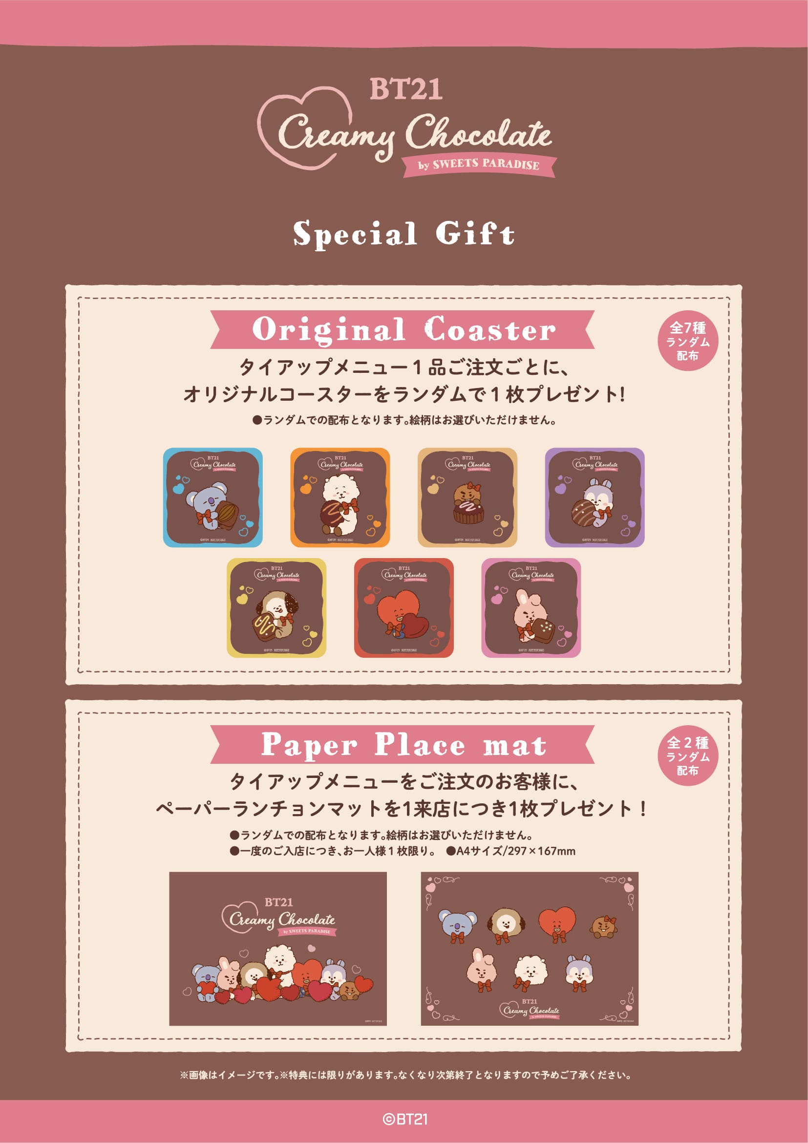 「BT21 × スイーツパラダイス4店舗」コラボにて、コラボメニューを注文すると「ランチョンマット (全2種)」をランダムに1枚、1品注文ごとに「コースター 全7種」がランダムに1枚プレゼントされる。