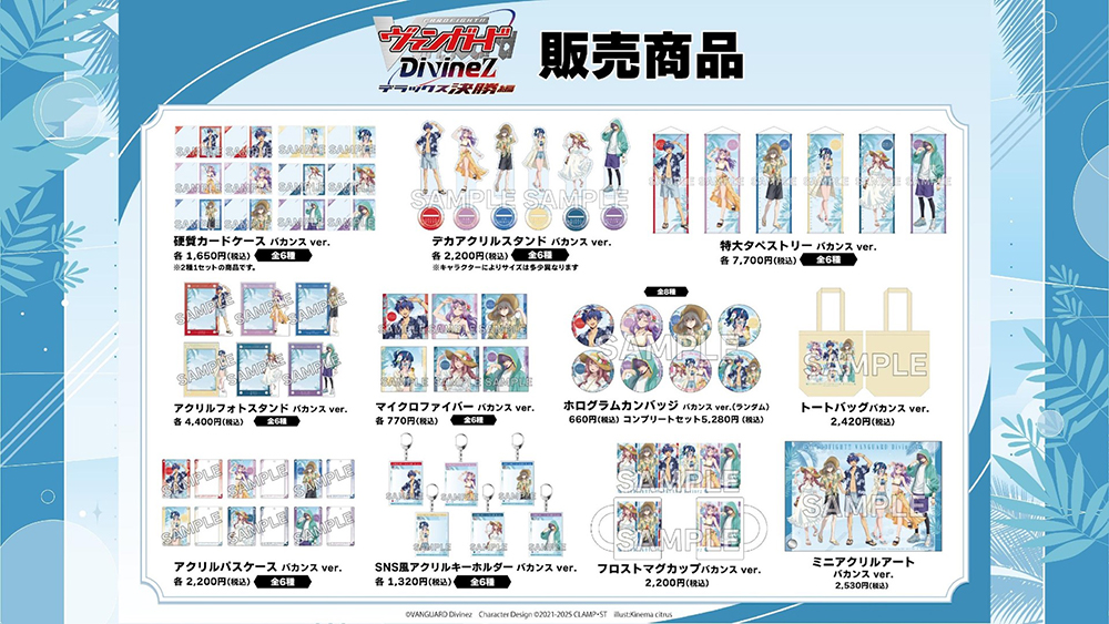 アニメ「カードファイト!! ヴァンガード Divinez(ディヴァインズ) デラックス決勝編」ポップアップストアでは、イベント限定の夏の爽やかな衣装に身を包んだ6人のイラストを使用した新作グッズが多数販売される。