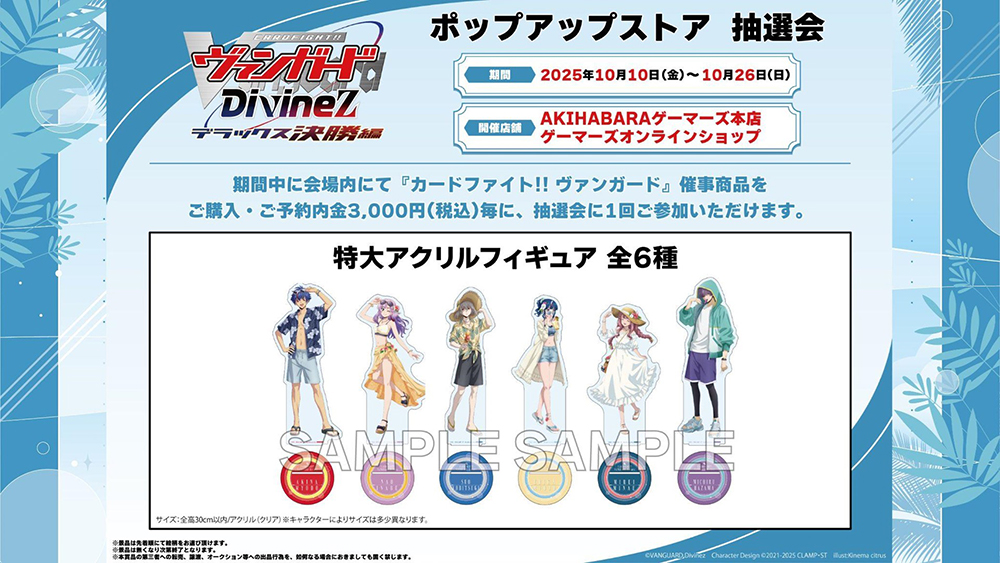 カードファイト!! ヴァンガード Divinez(ディヴァインズ) デラックス決勝編 ポップアップストアにて実施される抽選会では「特大アクリルフィギュア 全6種」がラインナップする。