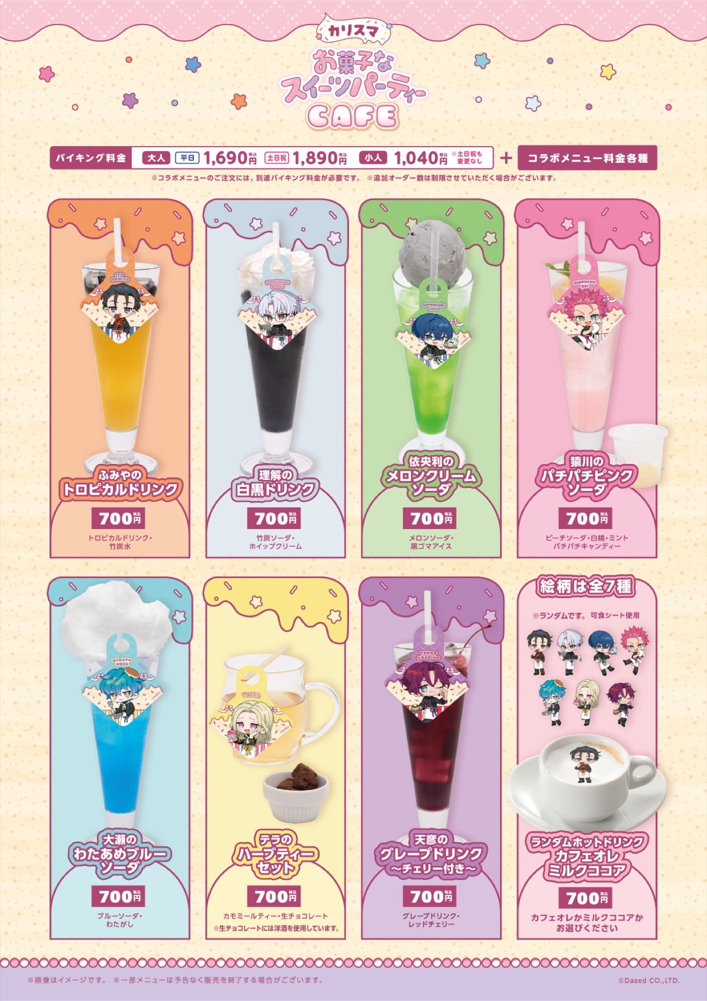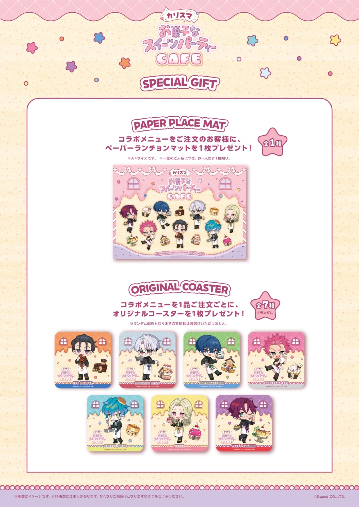 「カリスマ」コラボカフェでは、カリスマたちをイメージしたコラボメニューが楽しめる他、メニューを注文の方には「カリスマ」カフェ限定のノベルティー「オリジナルコースター 全7種」がランダムに1枚プレゼントされる。