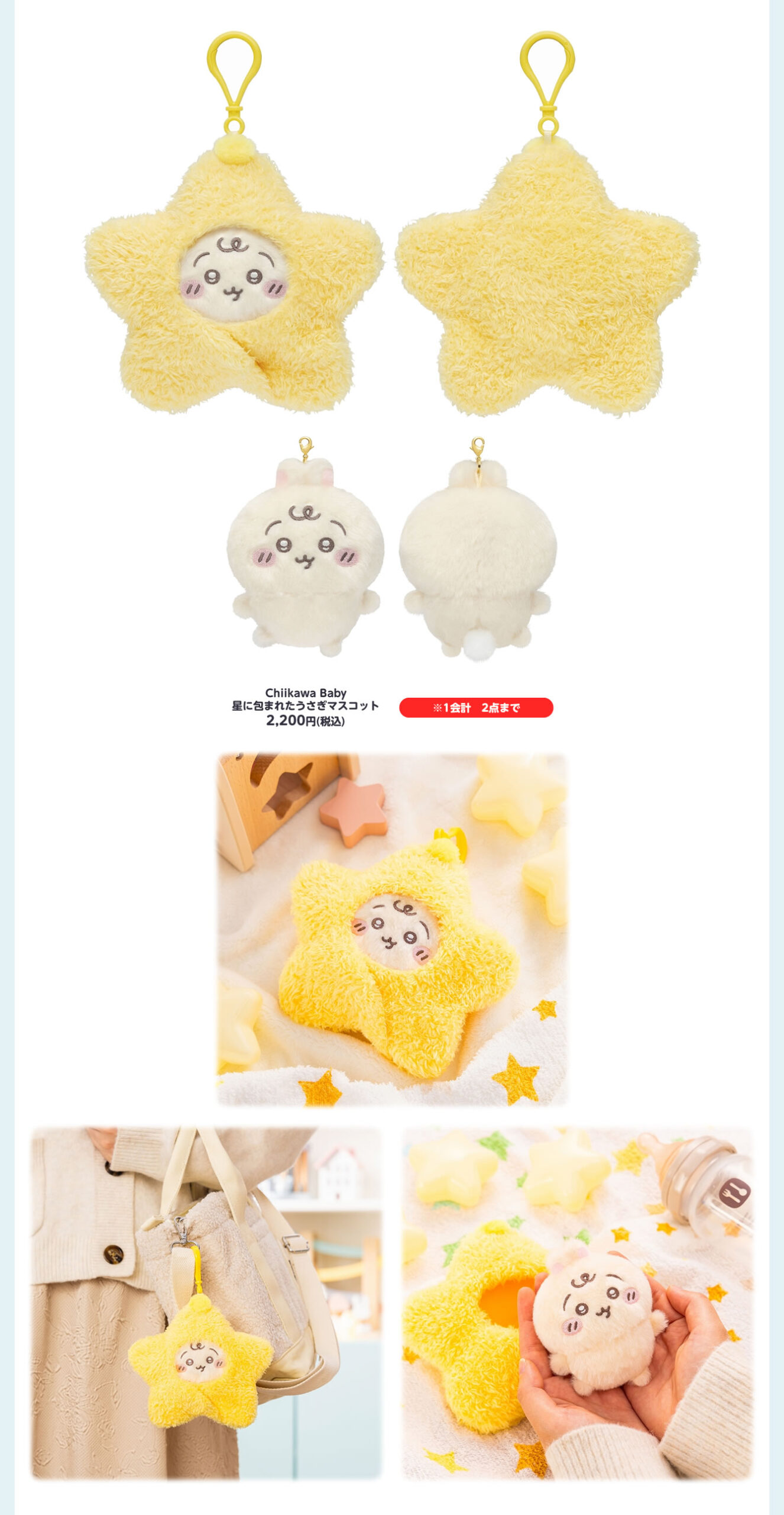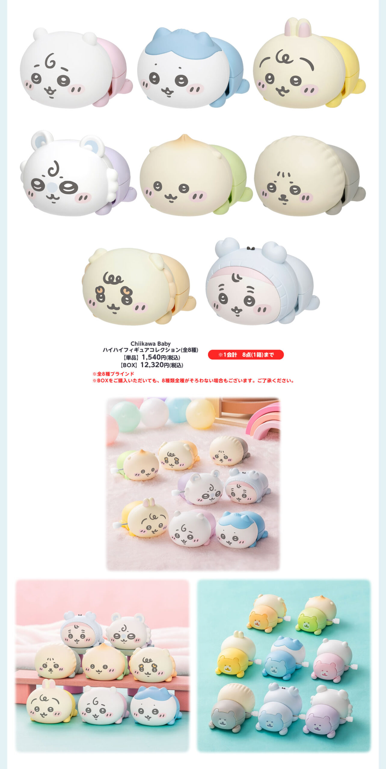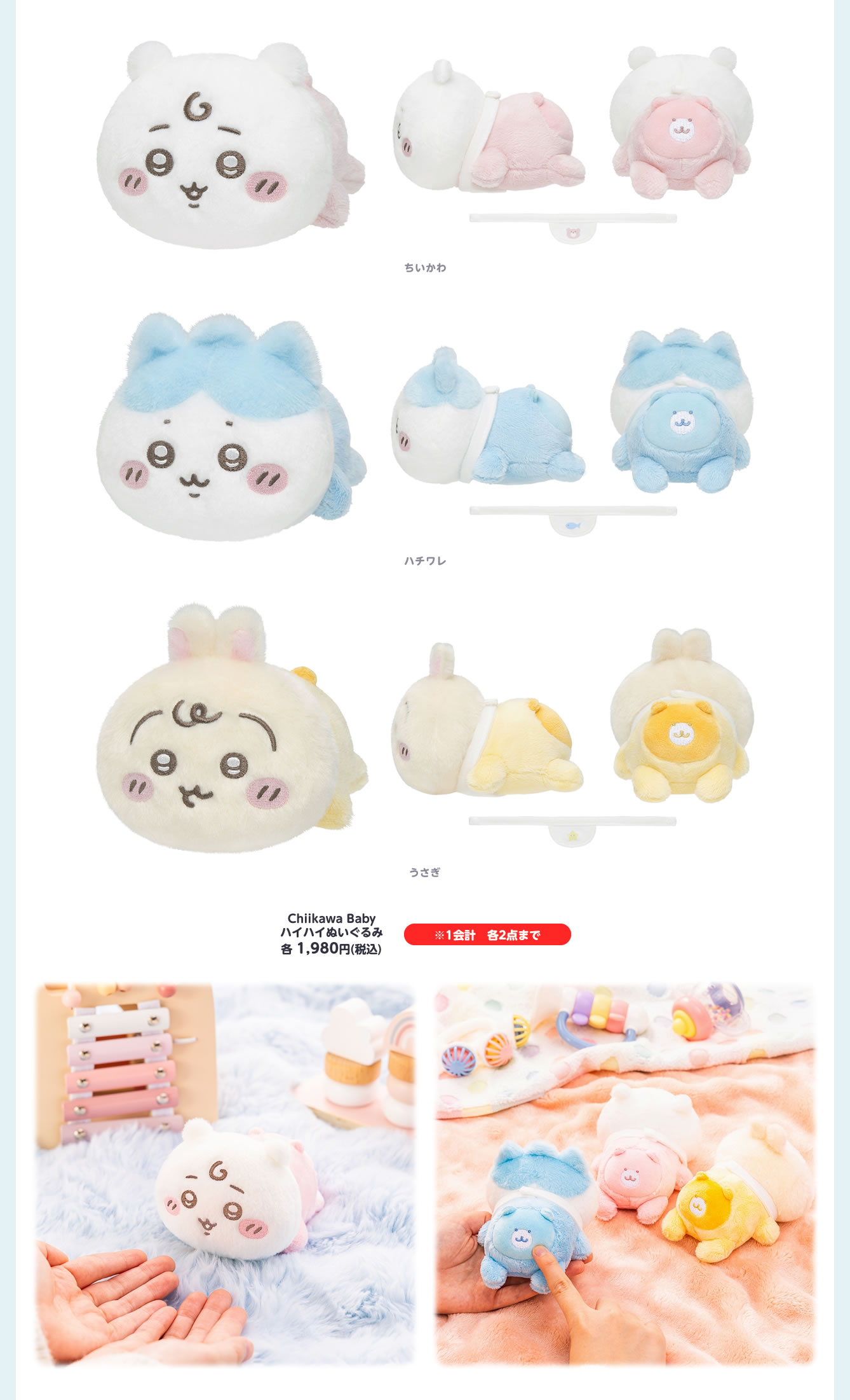 ハイハイしている姿がかわいい、ちいかわ・ハチワレ・うさぎたちのデザインを使用した「Chiikawa Baby ハイハイぬいぐるみ」「Chiikawa Baby ハイハイフィギュアコレクション(全8種)」や、「Chiikawa Baby 星に包まれたうさぎマスコット」などがラインナップする。