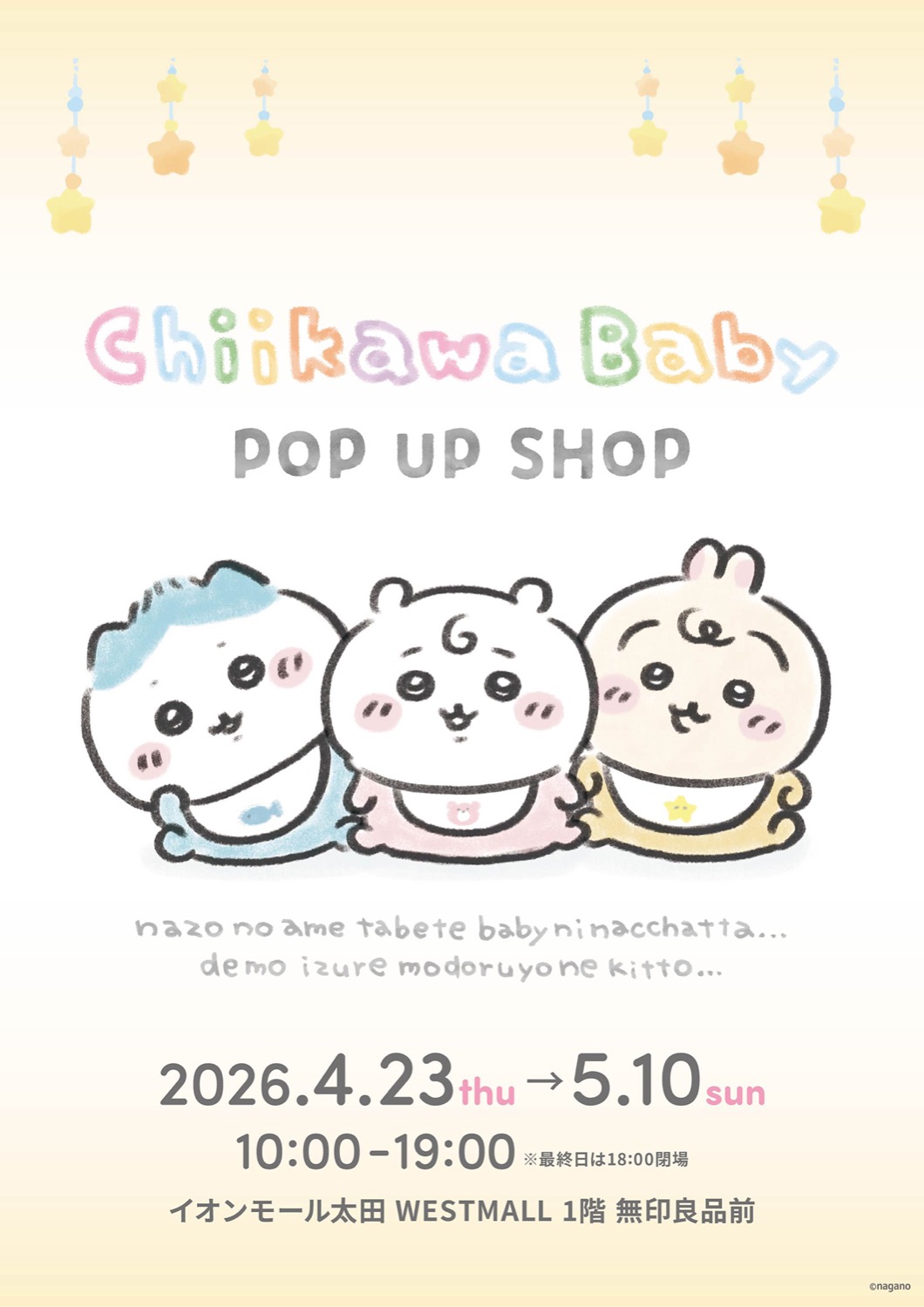 不器用ながらも何事も一生懸命頑張って仲間と強く生きている姿が尊い「ちいかわ (なんか小さくてかわいいやつ)」のポップアップストア『Chiikawa Baby POP UP SHOP』が、イオンモール太田 WESTMALL 1階にて2026年4月23日〜5月10日まで開催される。