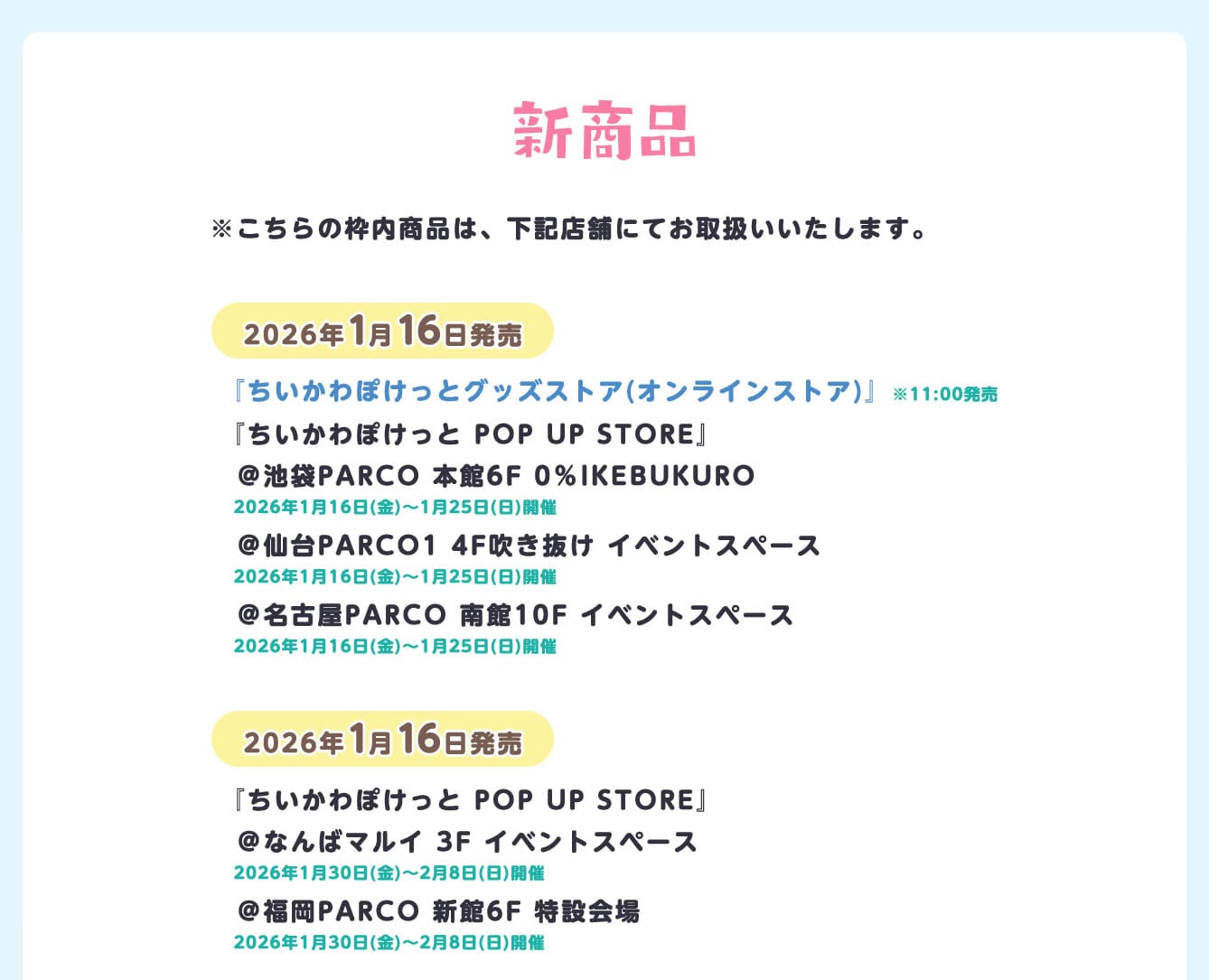 2026年1月16日より全国5箇所(東京/宮城/愛知/大阪/福岡)にて、『ちいかわぽけっと POP UP STORE』開催!