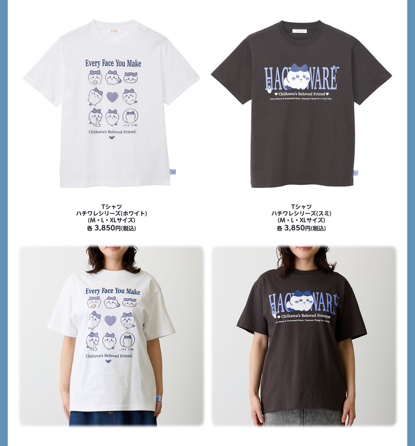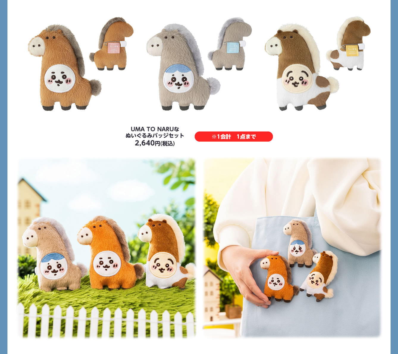 ちいかわ・ハチワレ・ウサギ・モモンガ・くりまんじゅう・ラッコ・シーサー・古本屋たちの、ゆるふわなイラストを使用した「ぼっちゃり手乗りぬいぐるみ」や、ハチワレが散りばめられた「Tシャツ ハチワレシリーズ ホワイト (M・L・XLサイズ)」のほか、「UMA TO NARUな ぬいぐるみバッジセット」などがラインナップする。