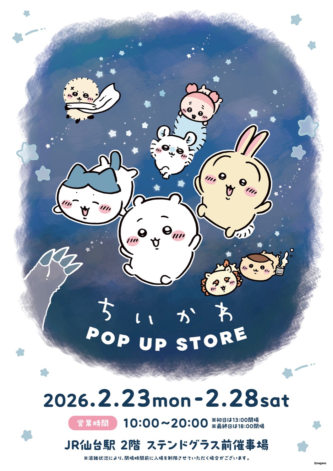 2026年2月23日より「JR仙台駅 (2階ステンドグラス前催事場)」にて、「ちいかわ」のポップアップストアを開催!