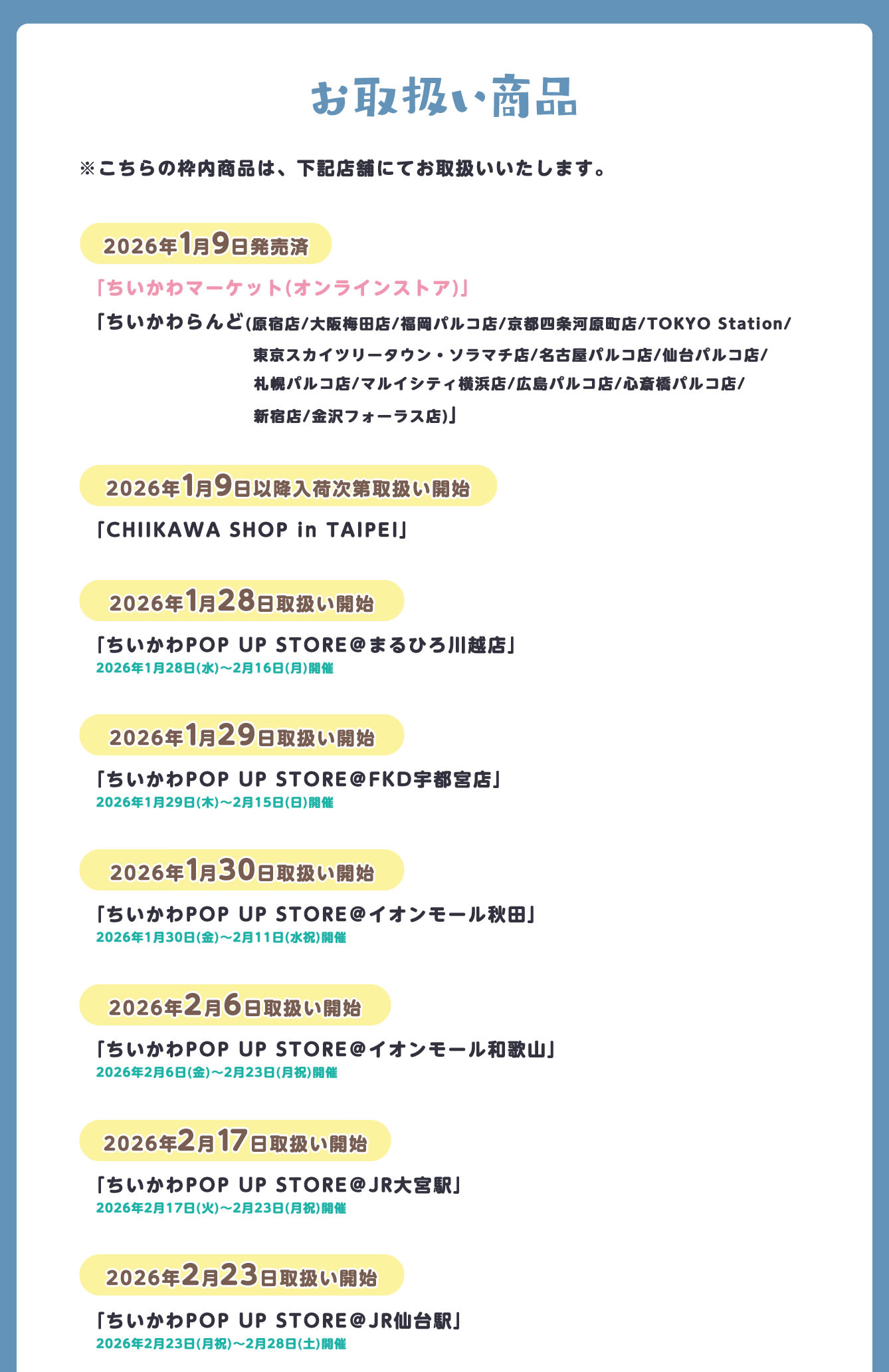なお、同日2月23日より、同会場にてまじかるちいかわ ストア in 宮城 JR仙台駅 2月23日より開催!が同時開催される。