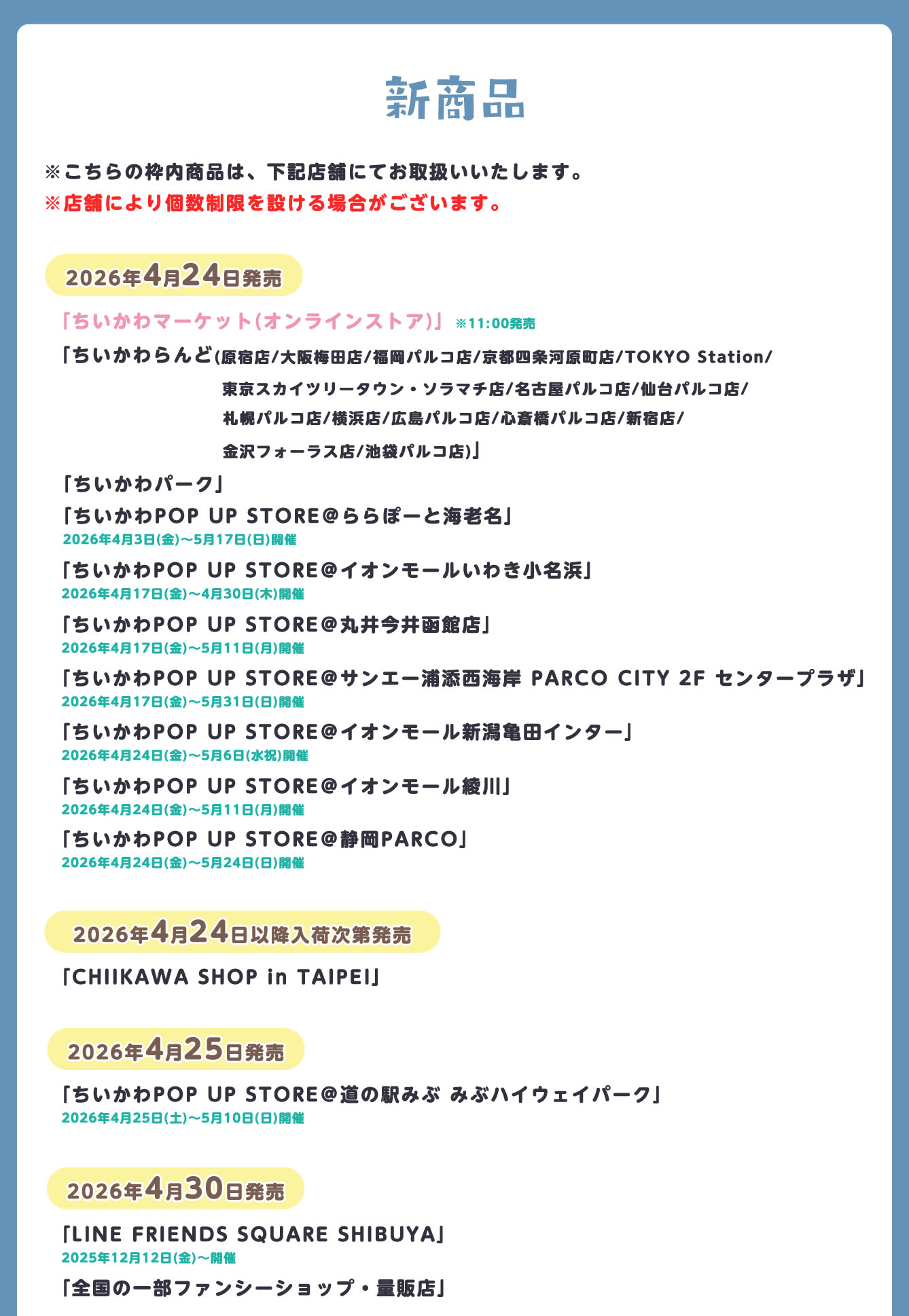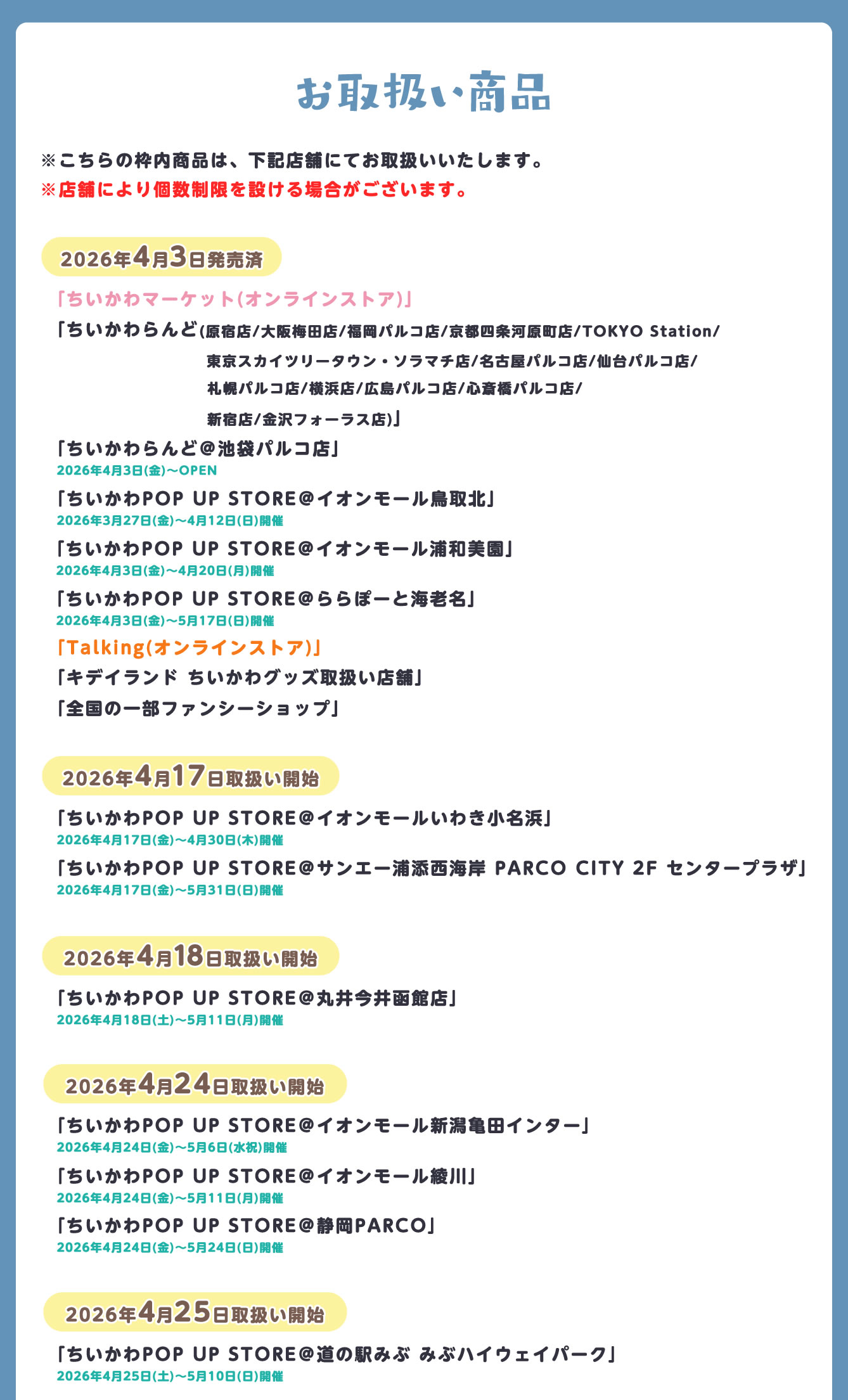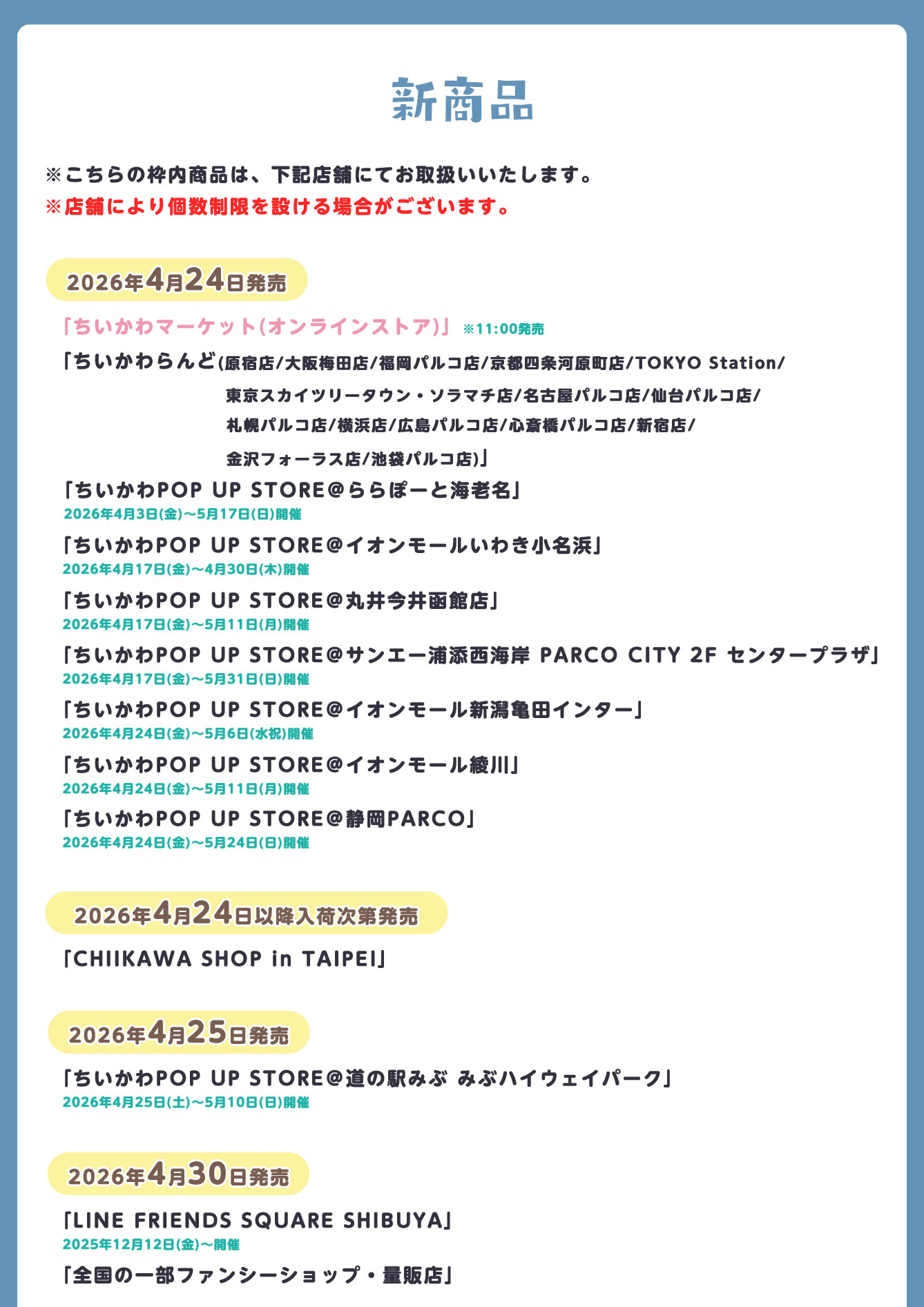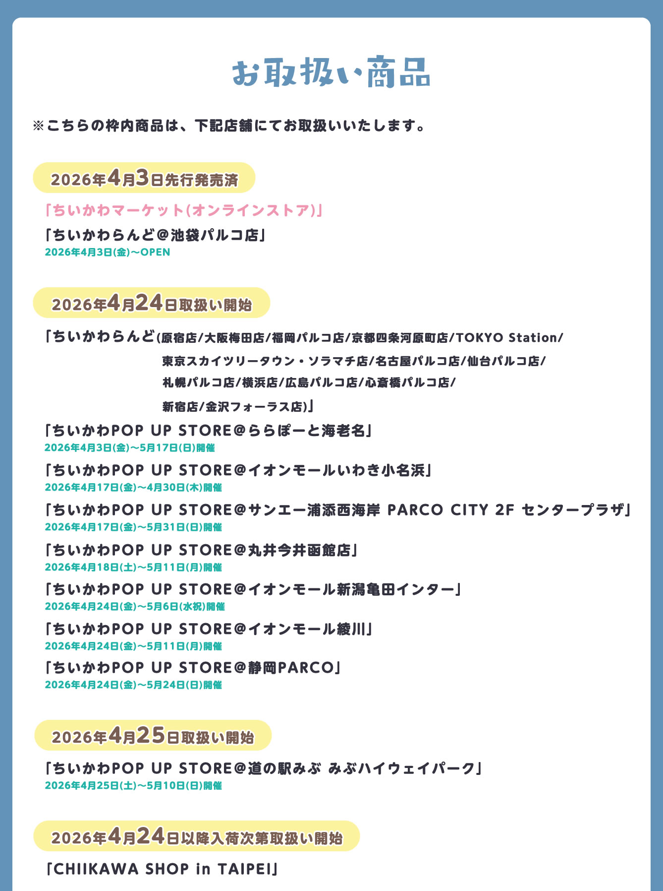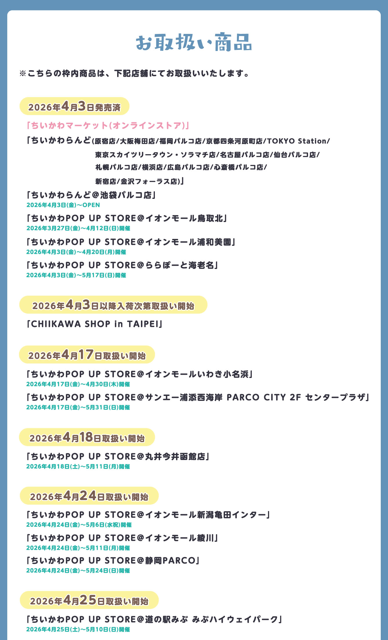 2026年4月24日より「静岡・新潟・栃木」にて、「ちいかわ」のグッズを販売するポップアップストアを開催!