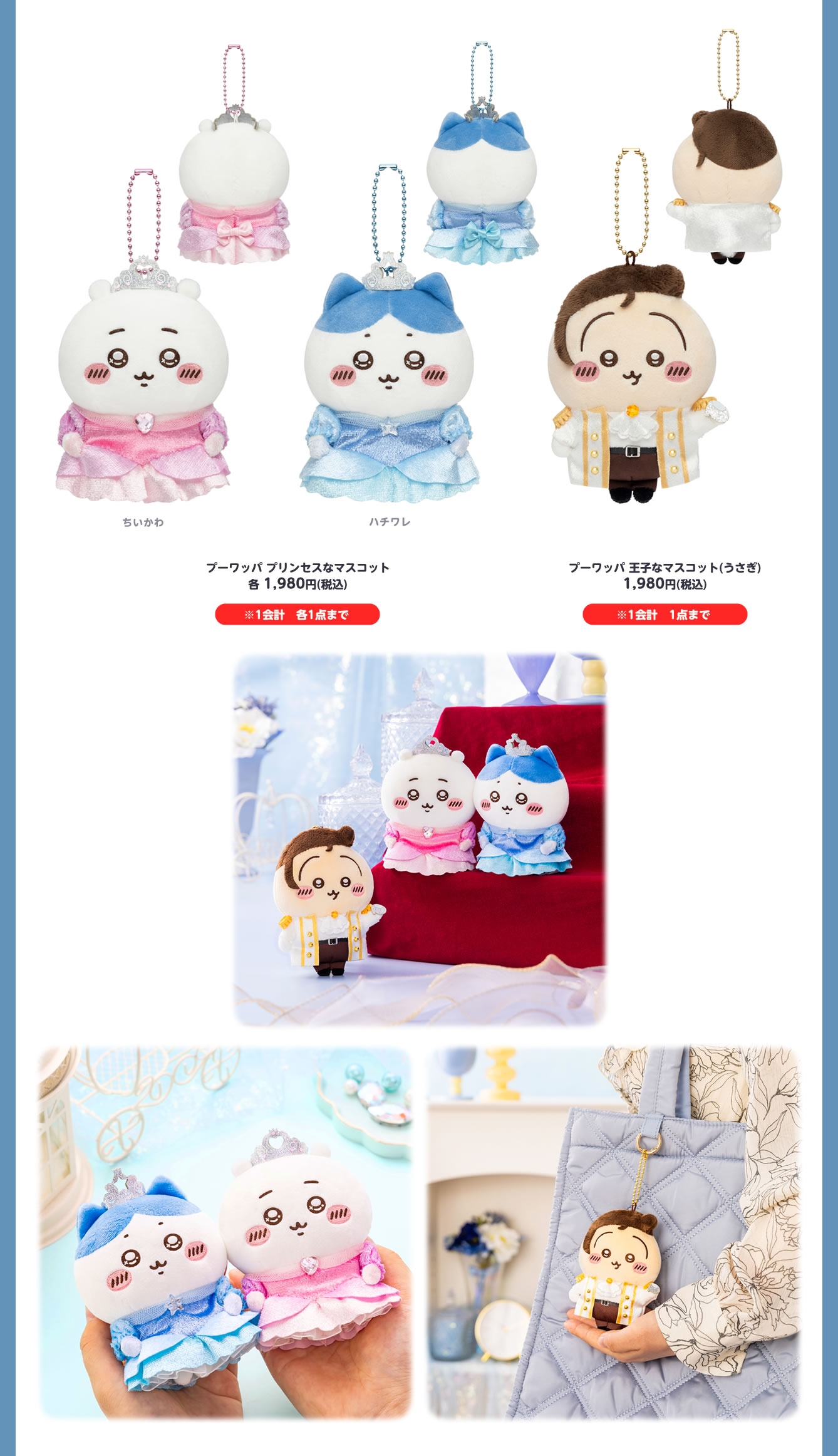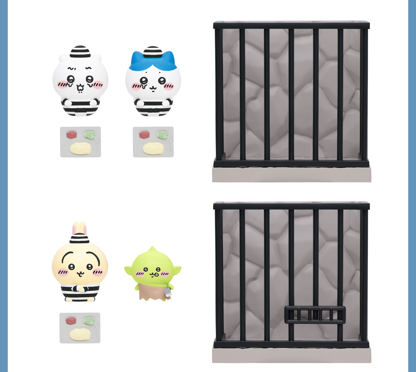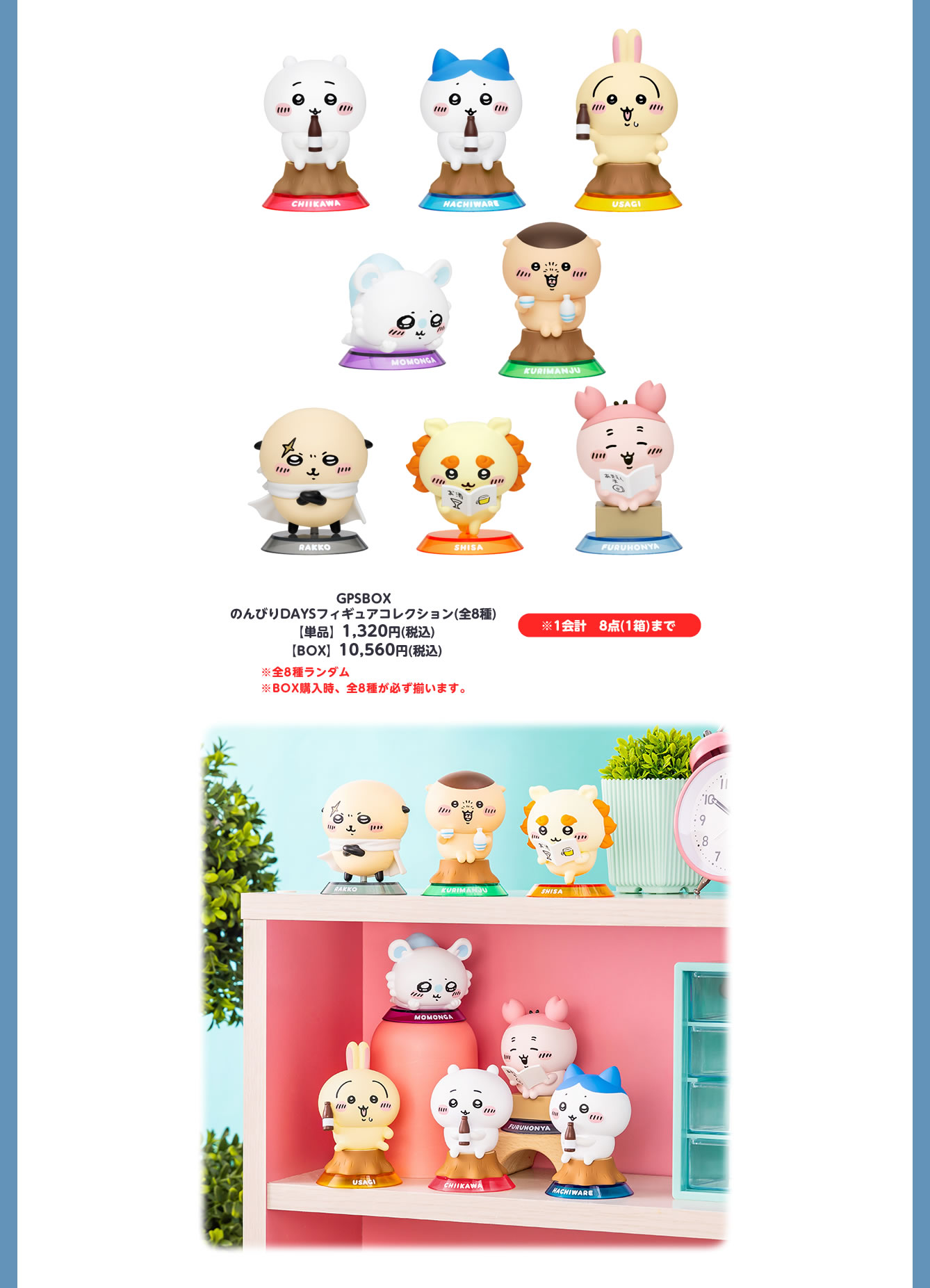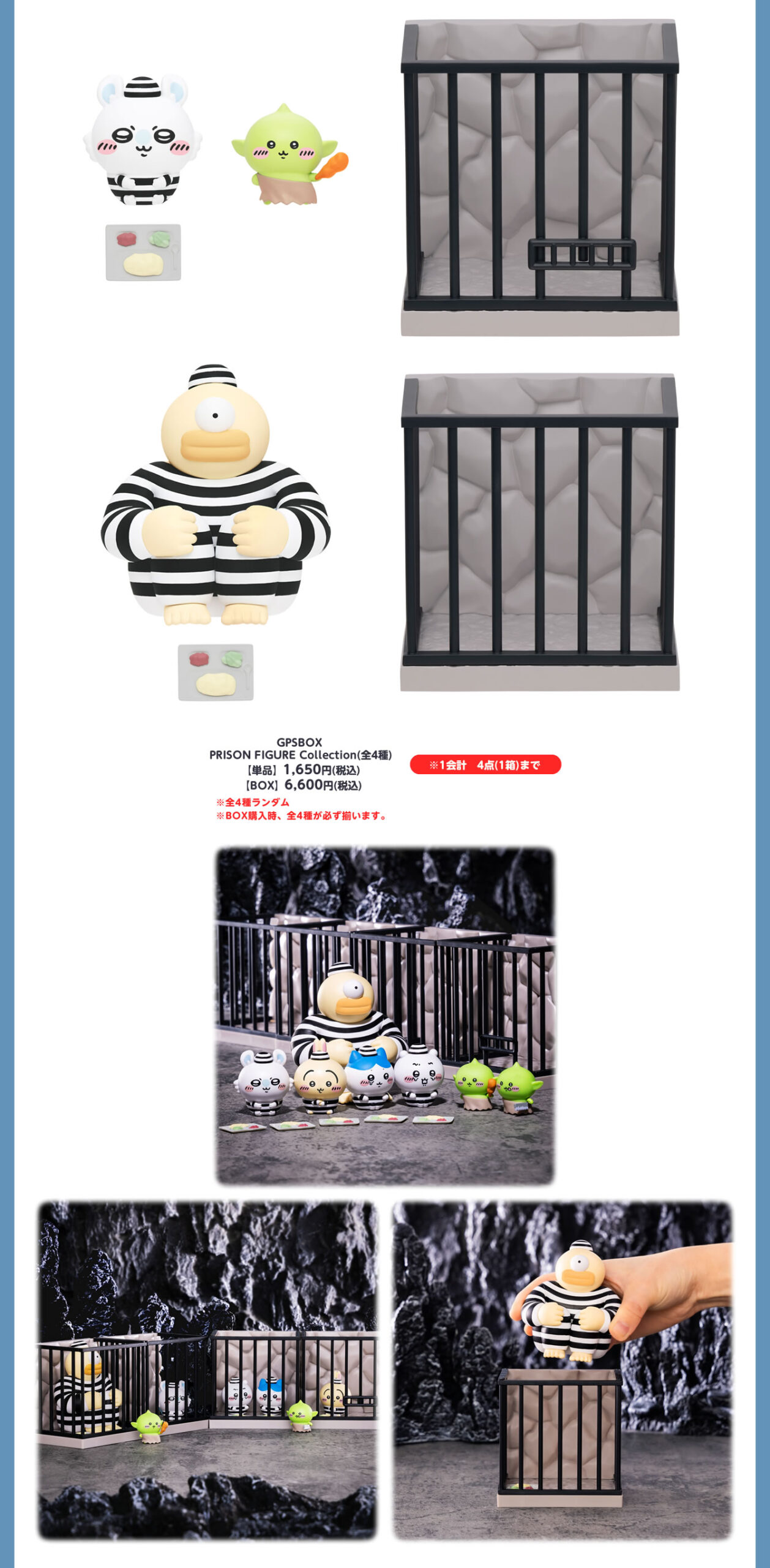 ちいかわ・ハチワレ・うさぎ・モモンガ・くりまんじゅう・ラッコ・シーサー・古本屋たちが、”囚人風衣装”や”プリンセス衣装”に身を包むデザインを使用した「GPSBOX のんびりDAYSフィギュアコレクション(全8種)」「GPSBOX PRISON FIGURE Collection(全4種)」「ちょこっとポージングぬいぐるみ」「プーワッパ プリンセスなマスコット」などがラインナップする。