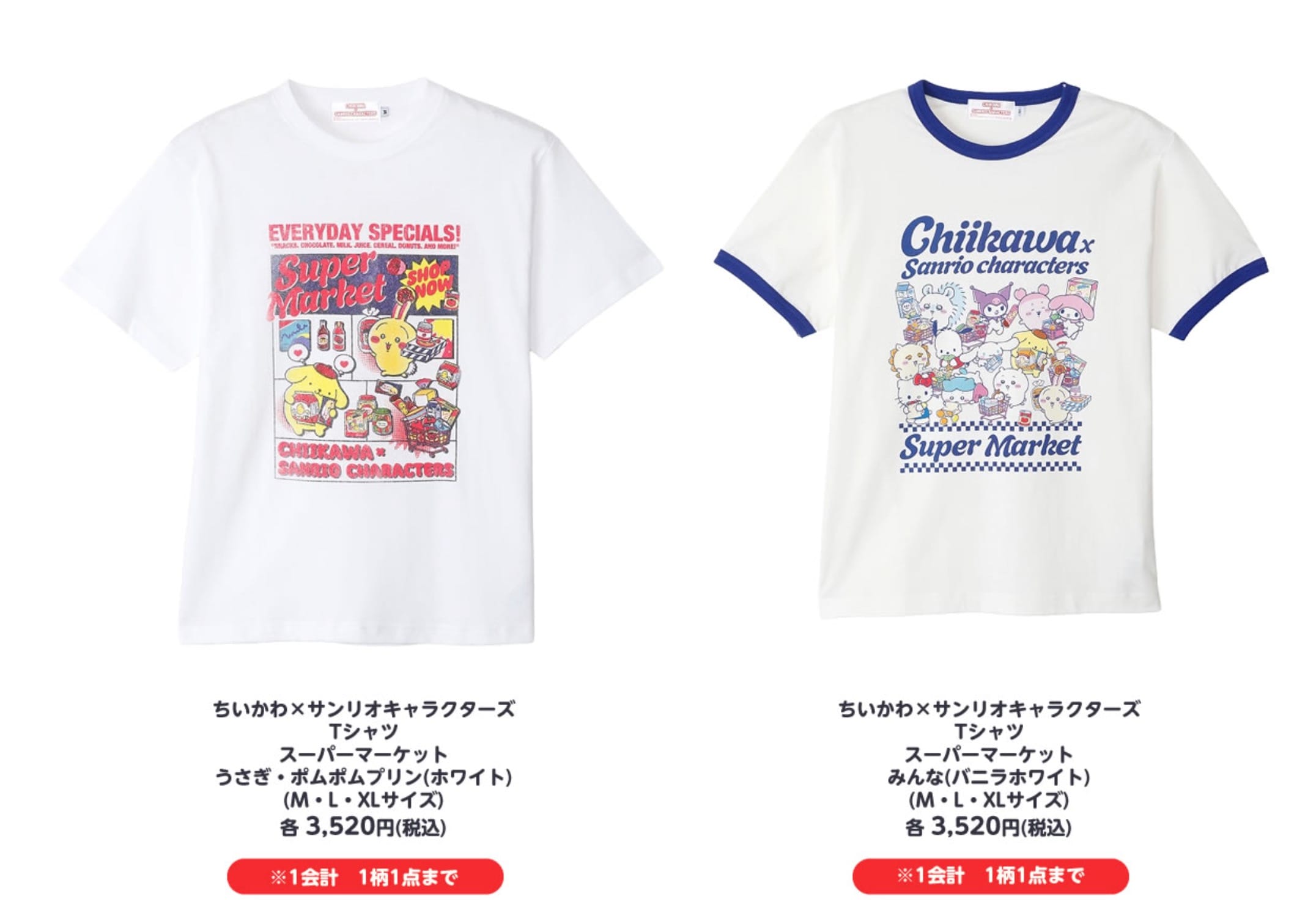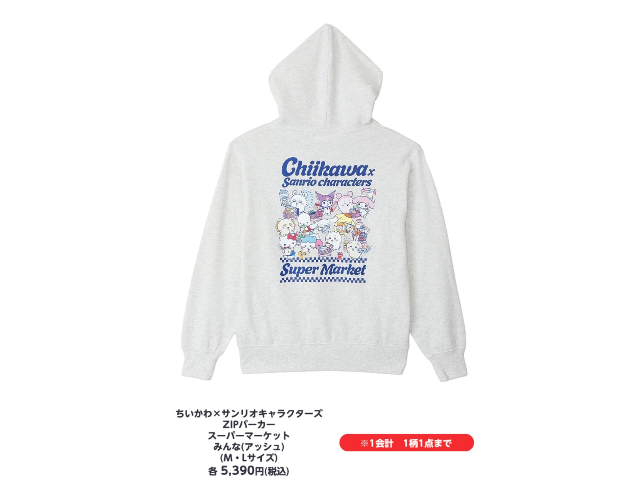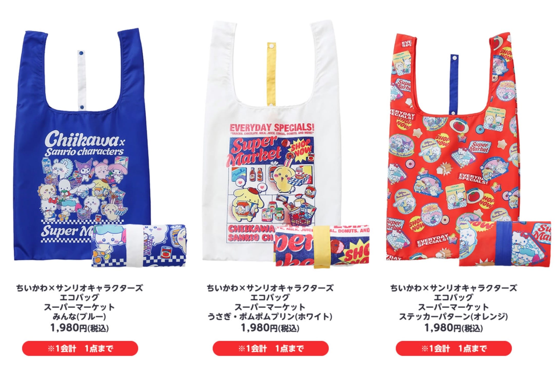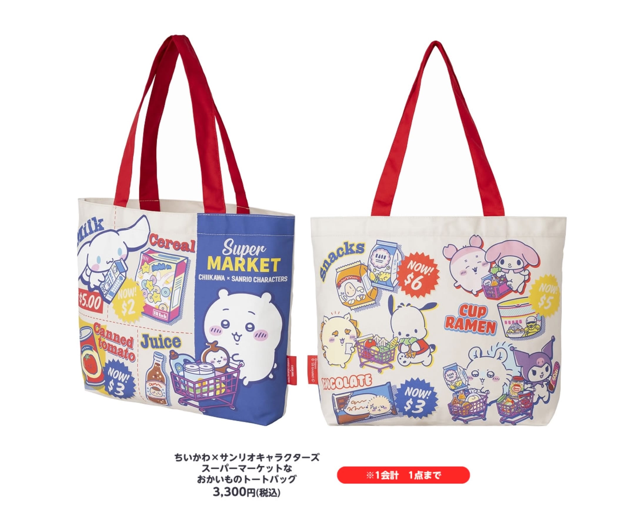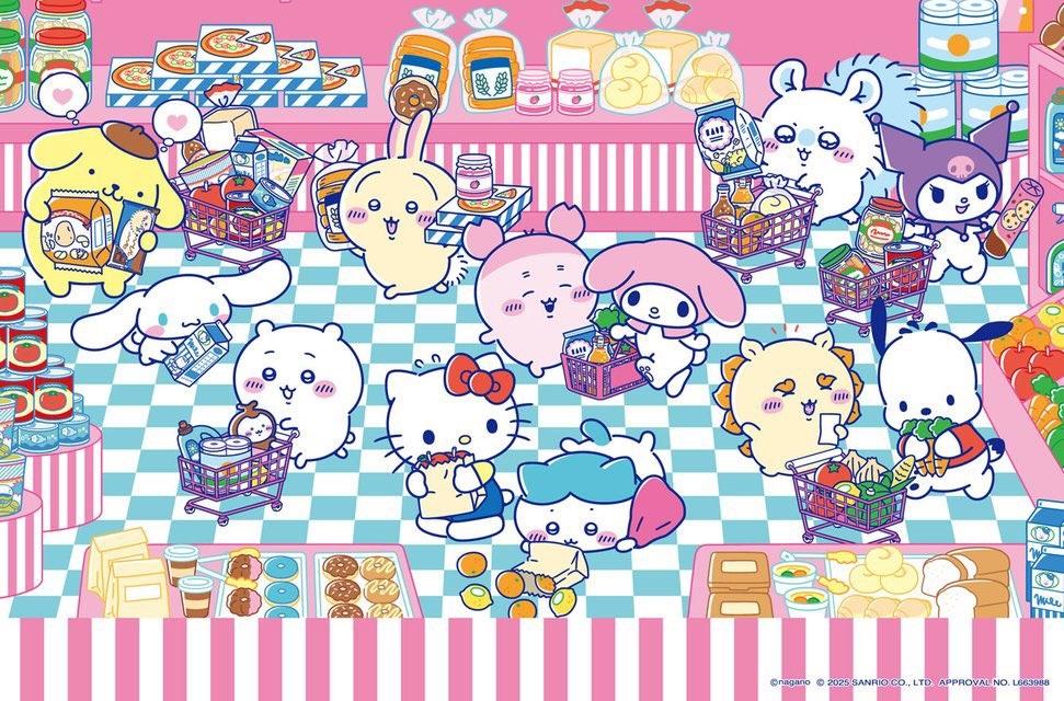 「ちいかわ × サンリオ」ポップアップストアでは、スーパーマーケットで買い物するちいかわたちとサンリオキャラクターズのコラボイラストを使用したオリジナルグッズが多数発売。
