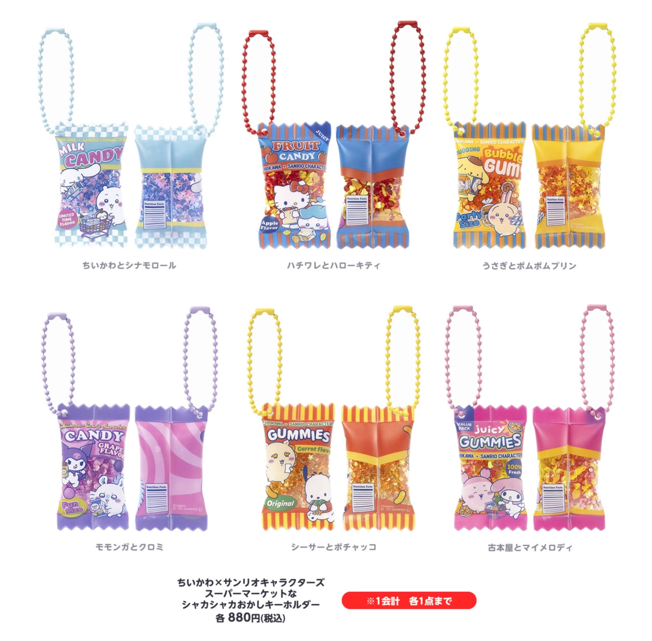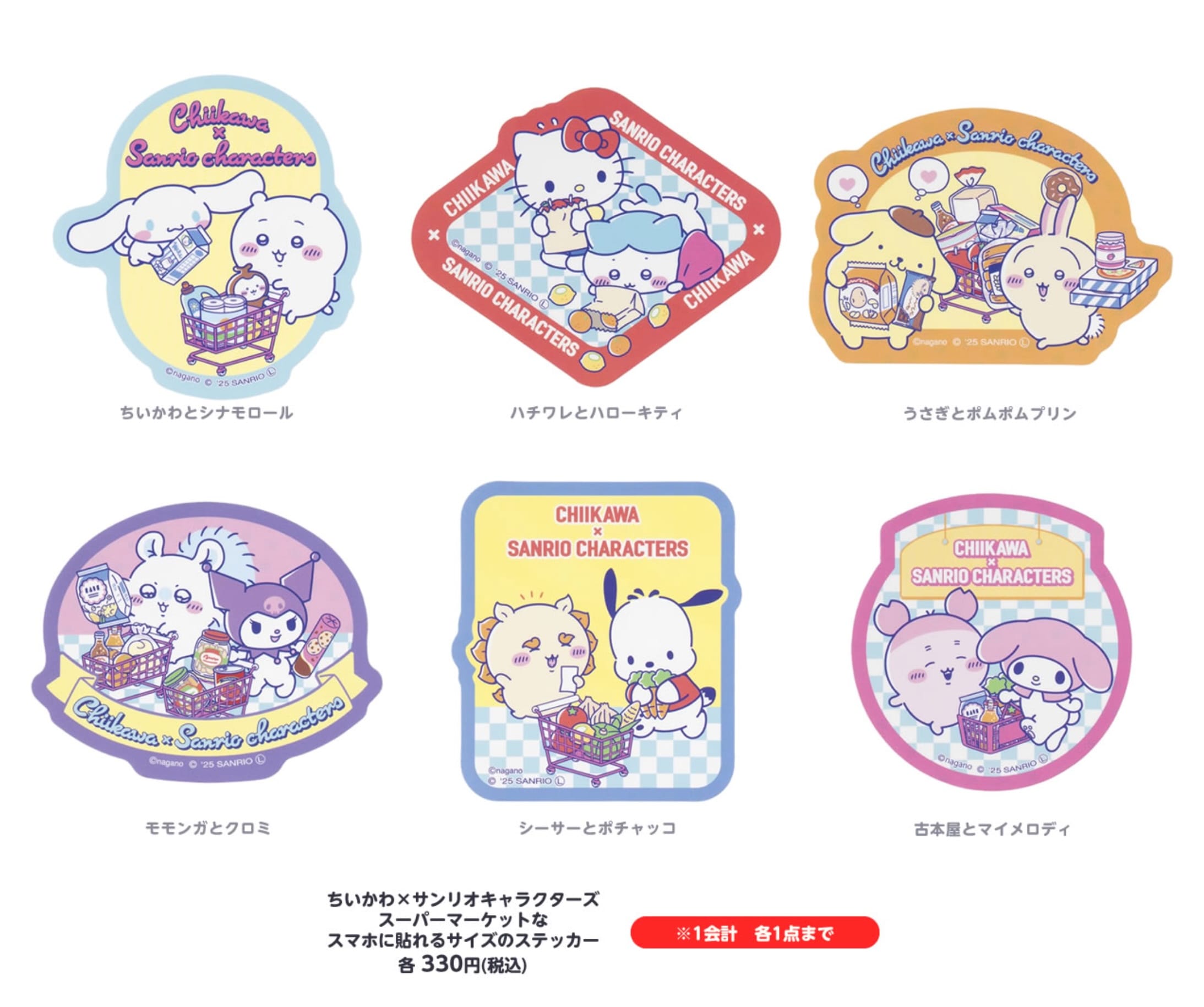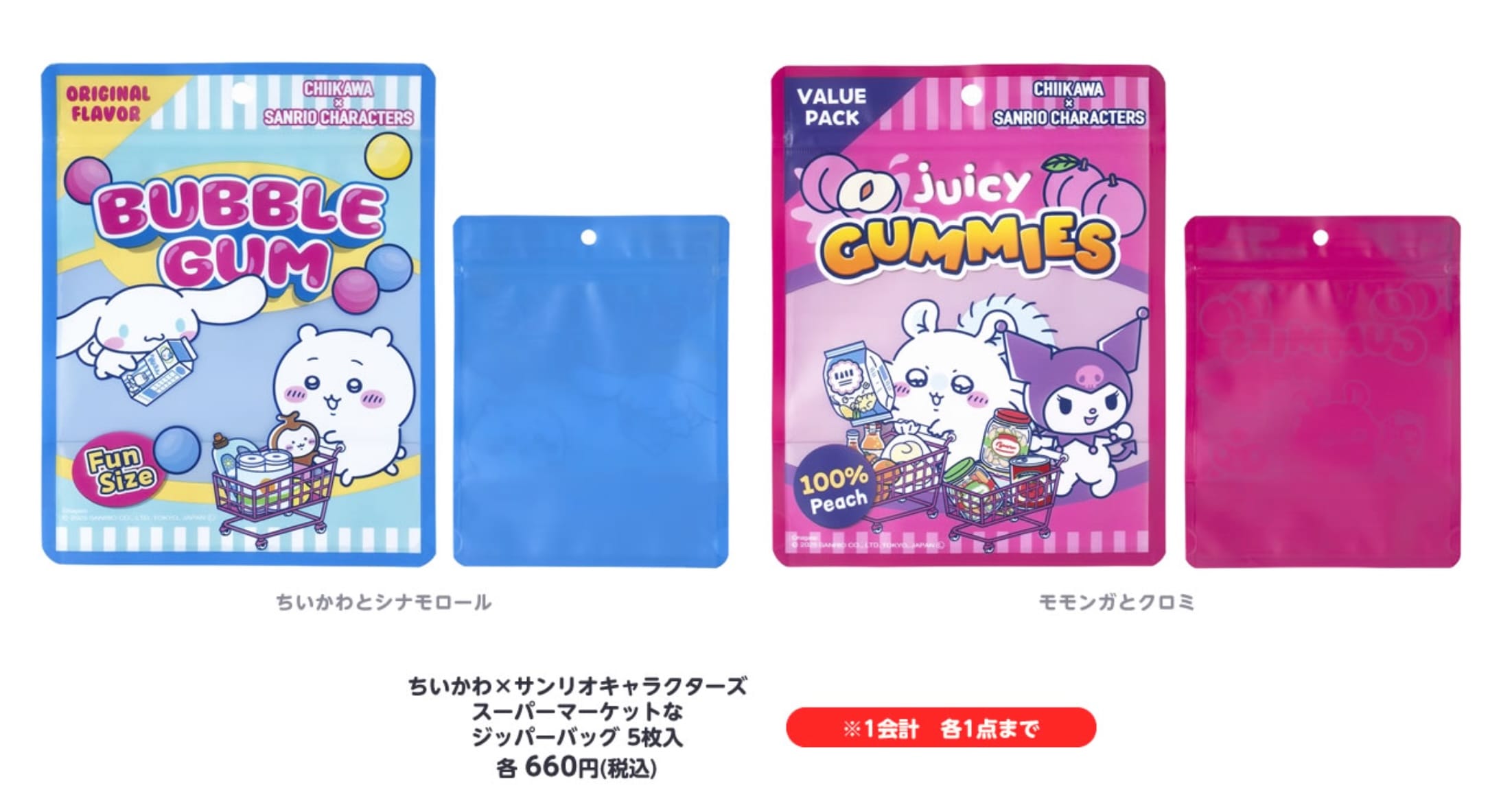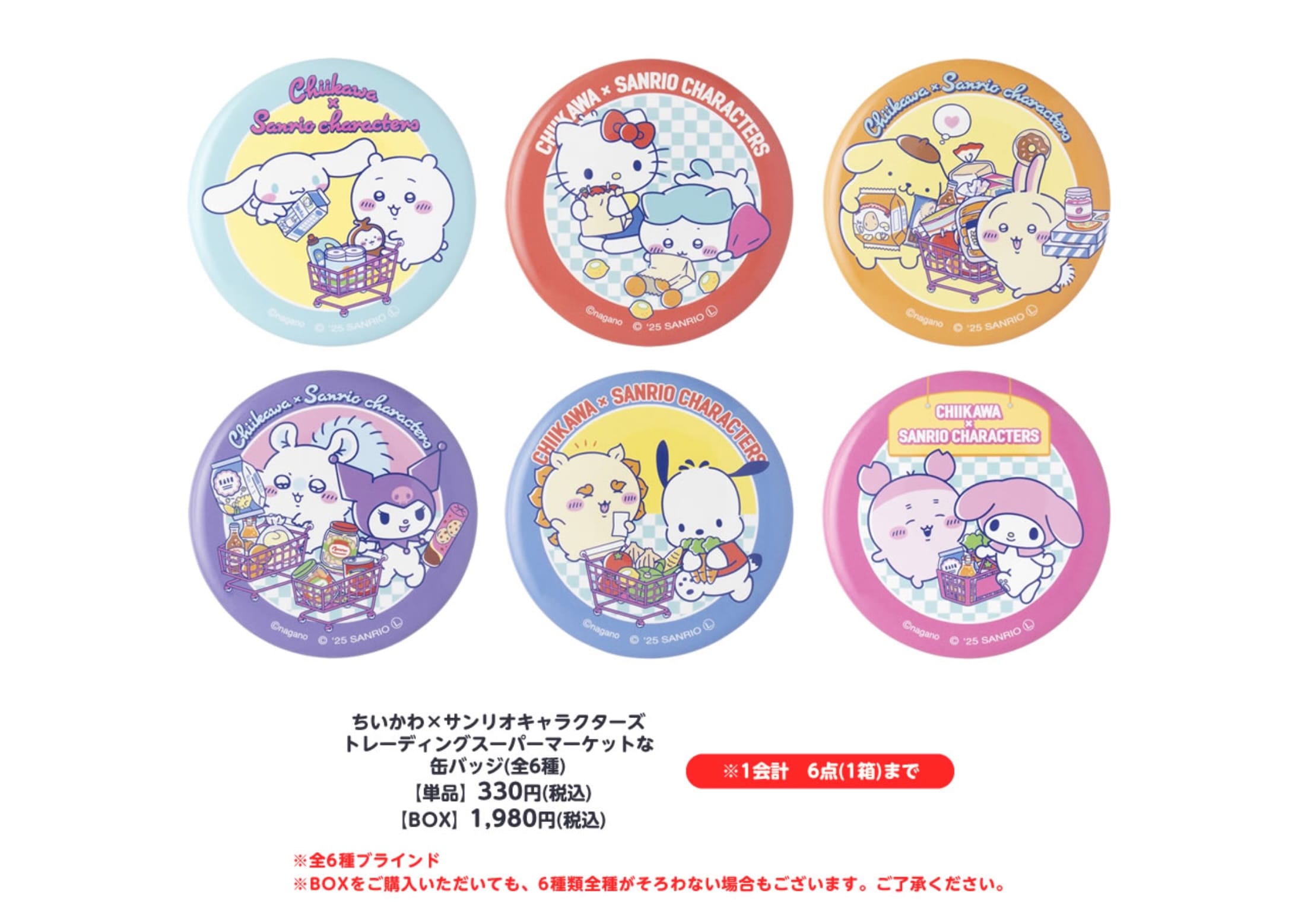 「ちいかわ × サンリオ」ポップアップストアでは、スーパーマーケットで買い物するちいかわたちとサンリオキャラクターズのコラボイラストを使用したオリジナルグッズが多数発売。