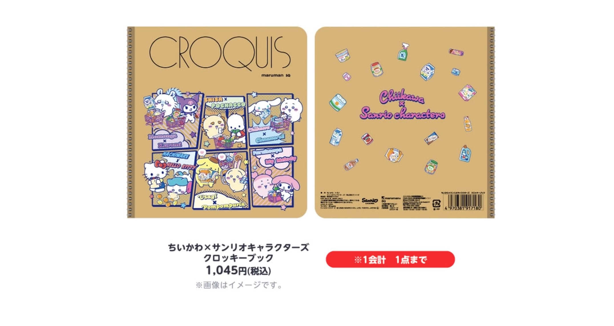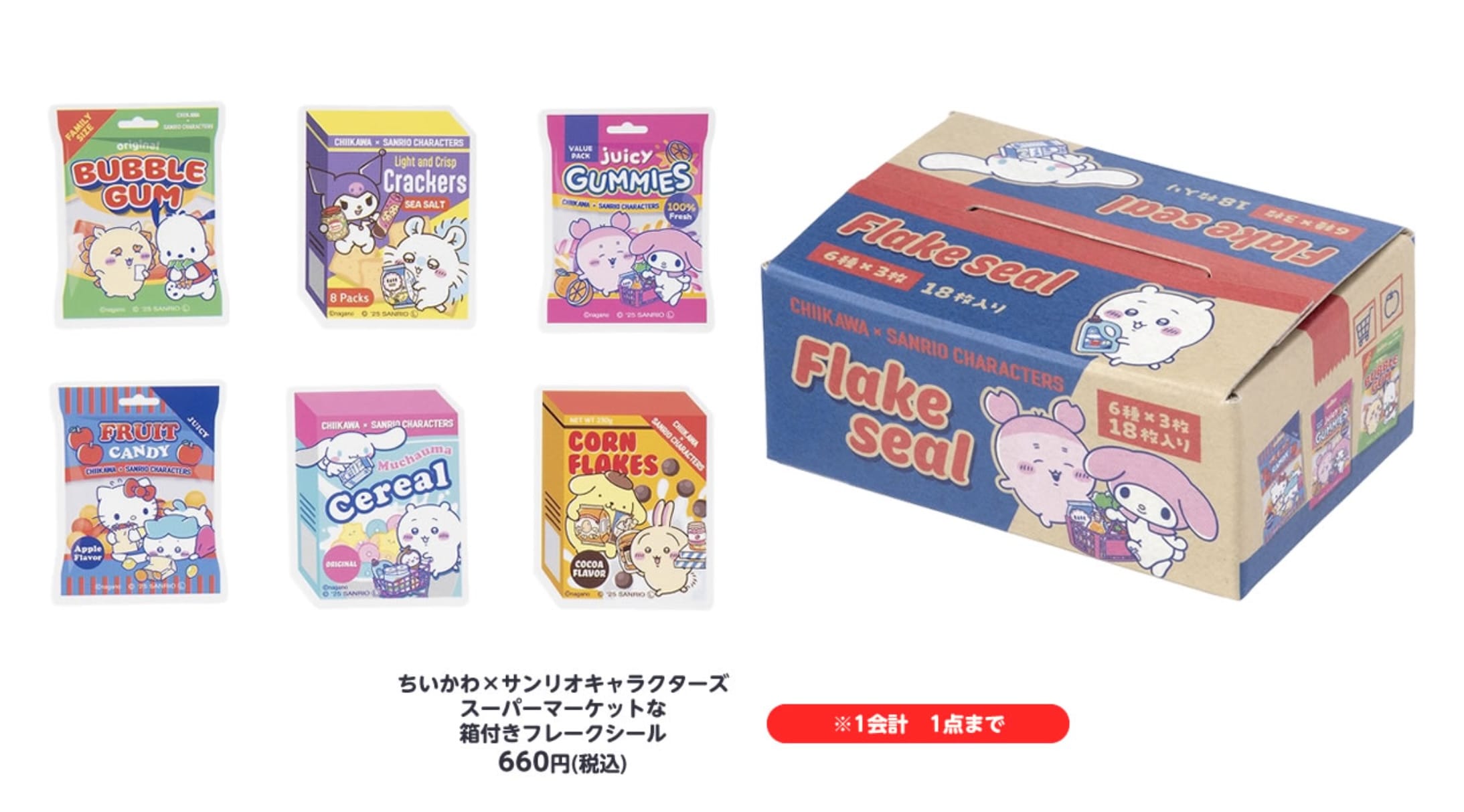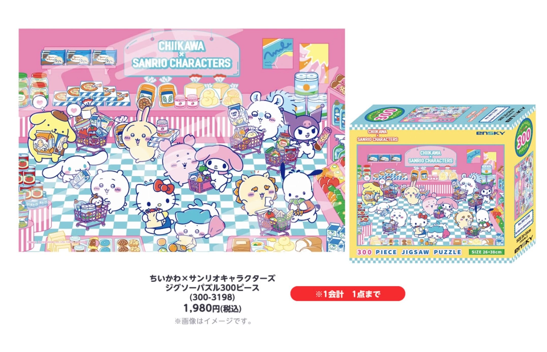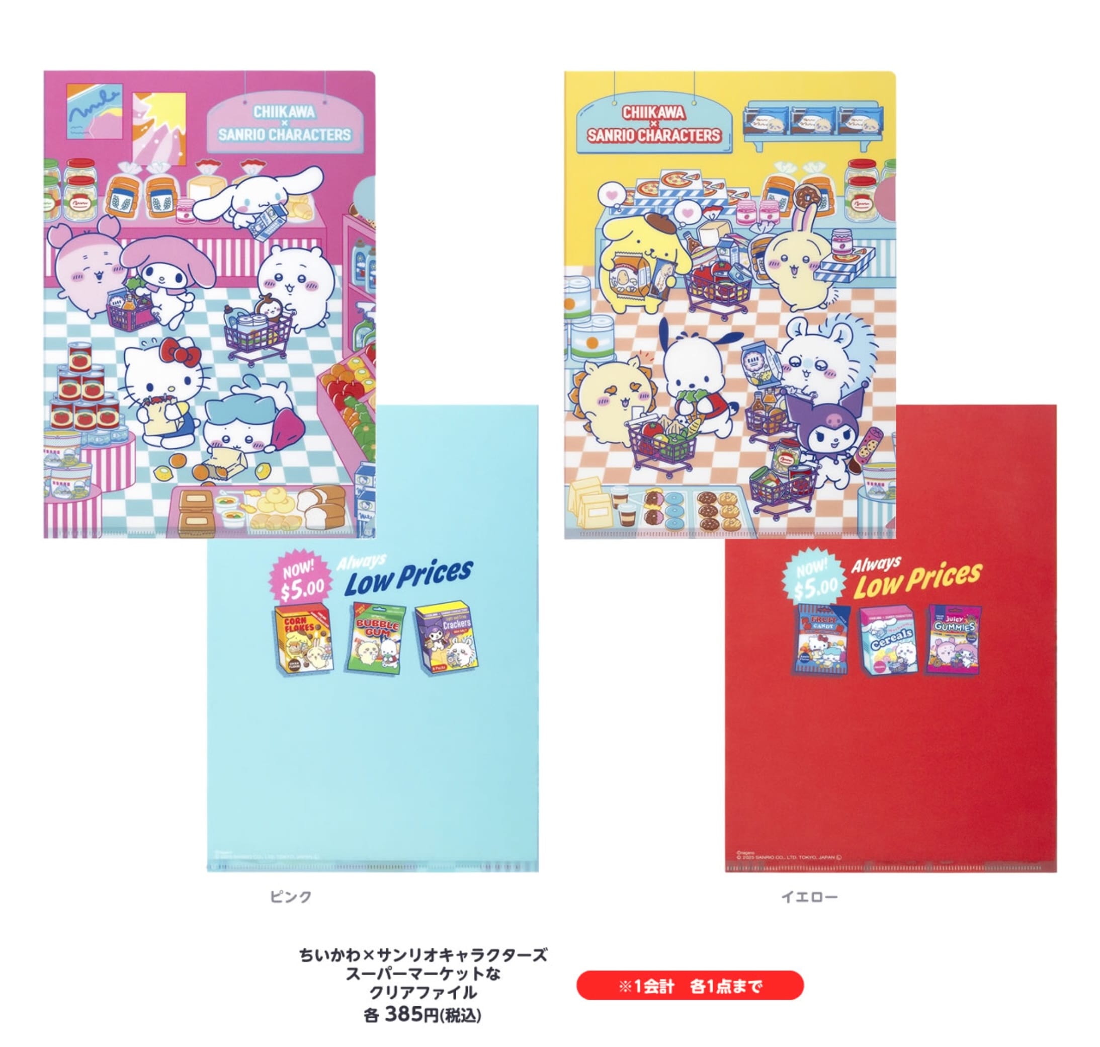 「ちいかわ × サンリオ」ポップアップストアでは、スーパーマーケットで買い物するちいかわたちとサンリオキャラクターズのコラボイラストを使用したオリジナルグッズが多数発売。