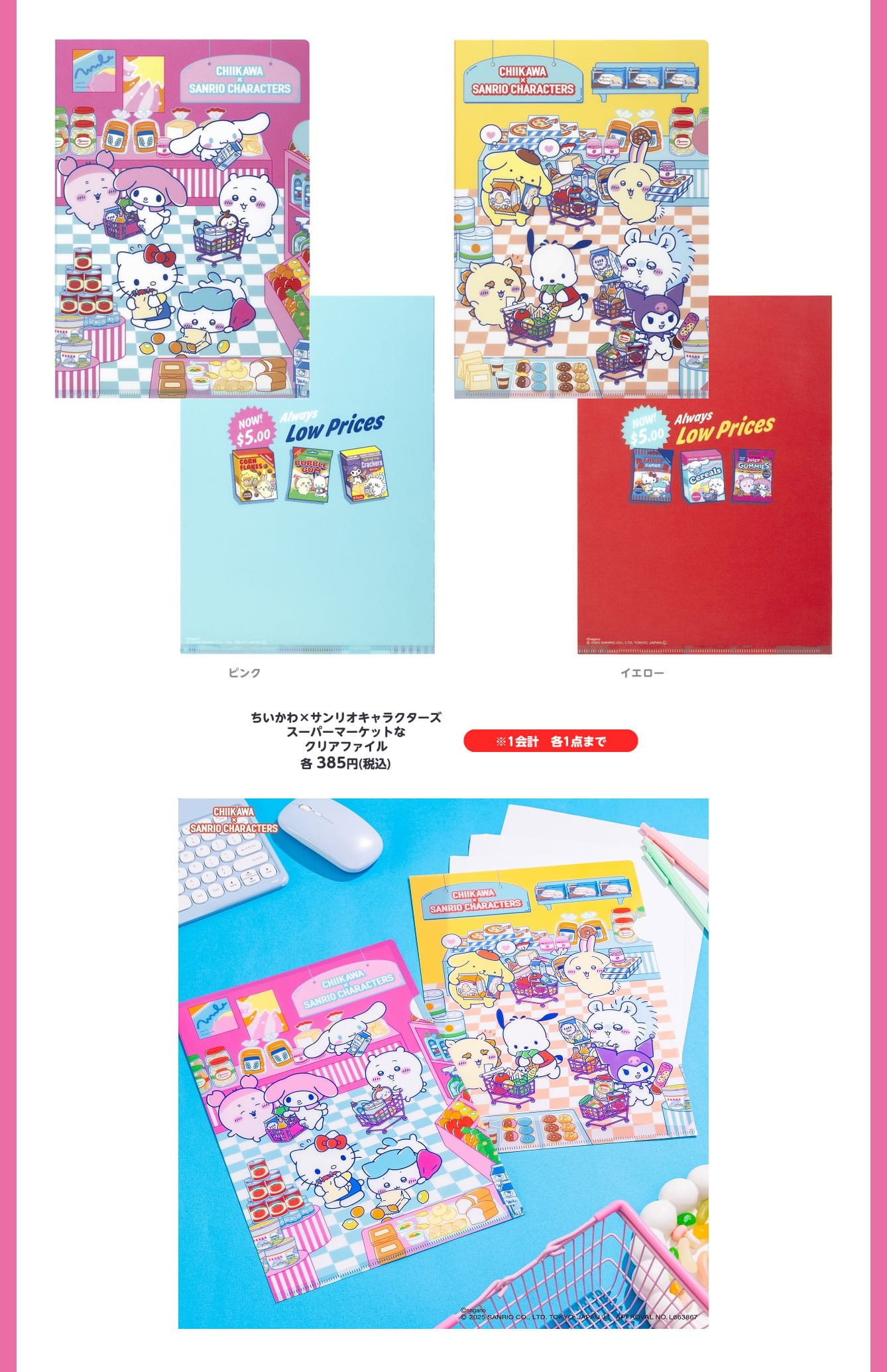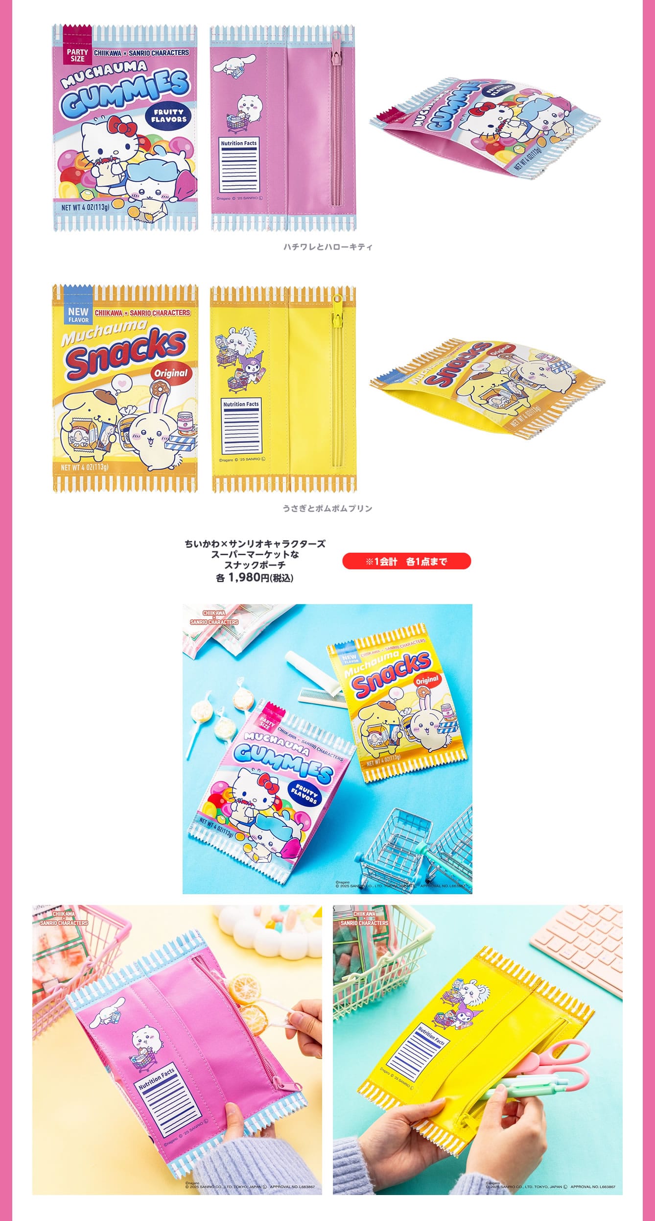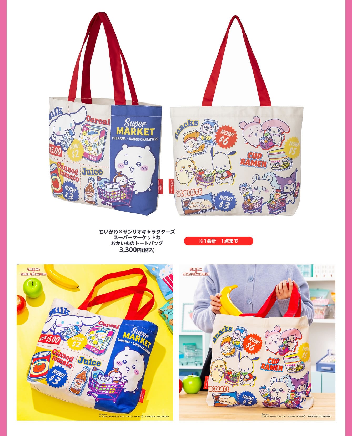 一緒にお買い物をするちいかわ・シナモン・ハチワレ・キティ・うさぎ・ポムポムプリン・モモンガ・クロミ・古本屋・マイメロディ・シーサー・ポチャッコのグッズが多数ラインナップ!