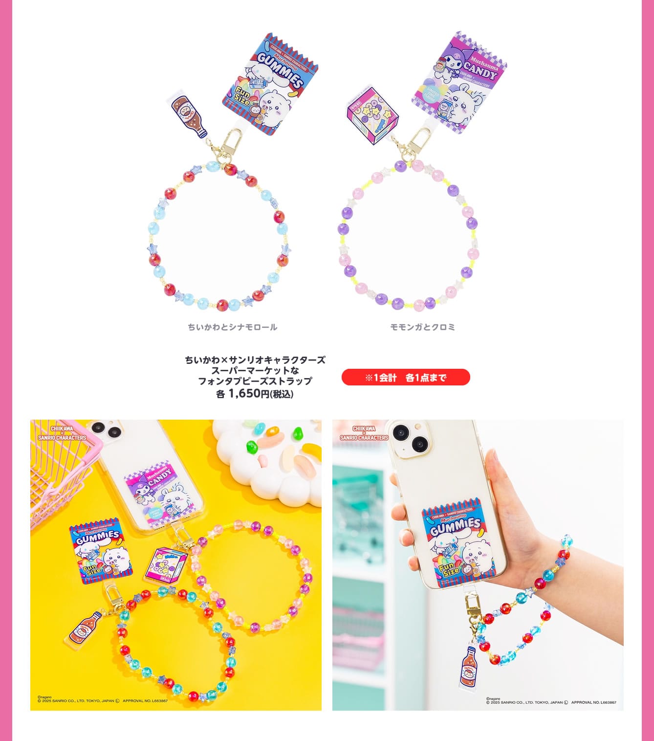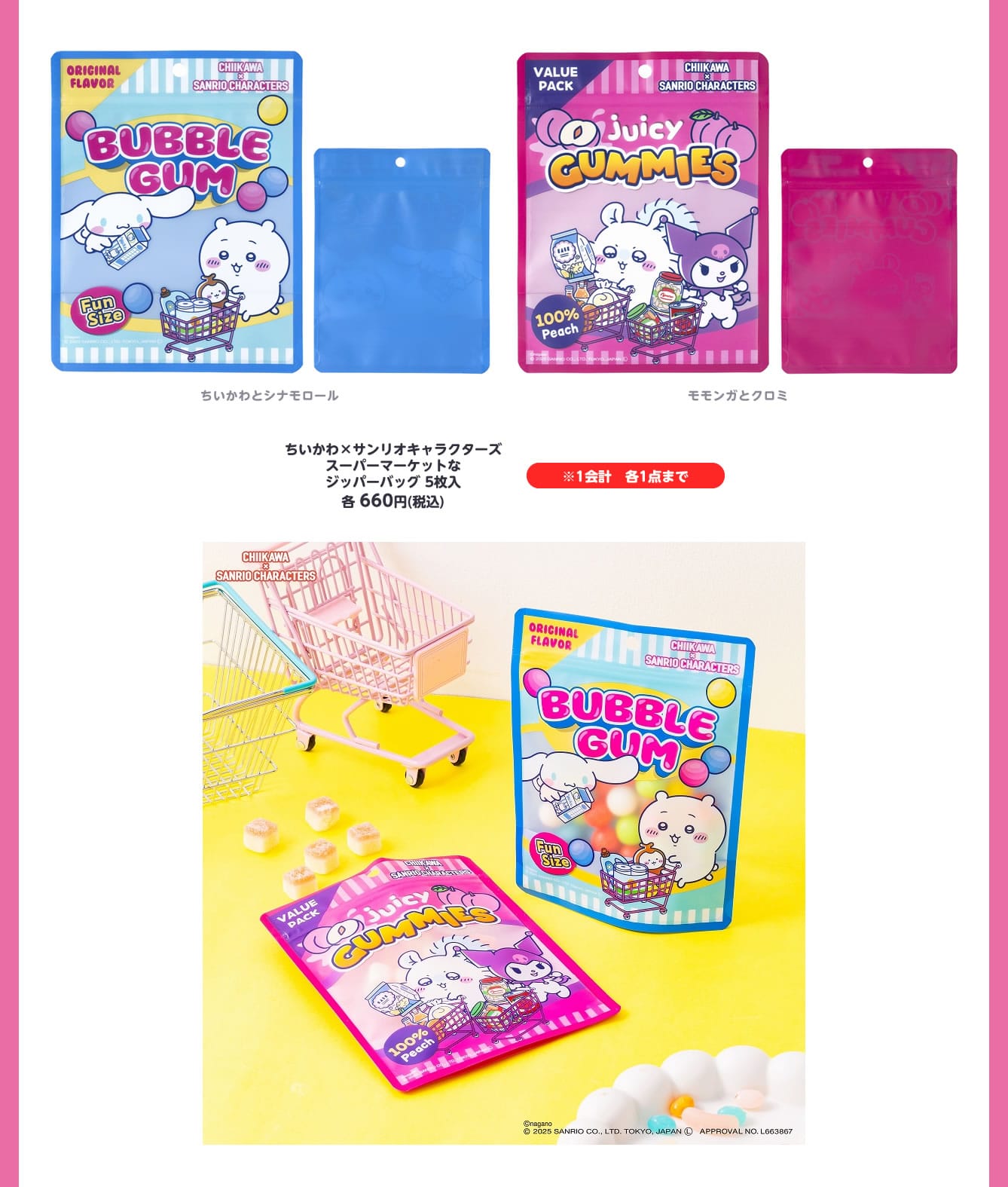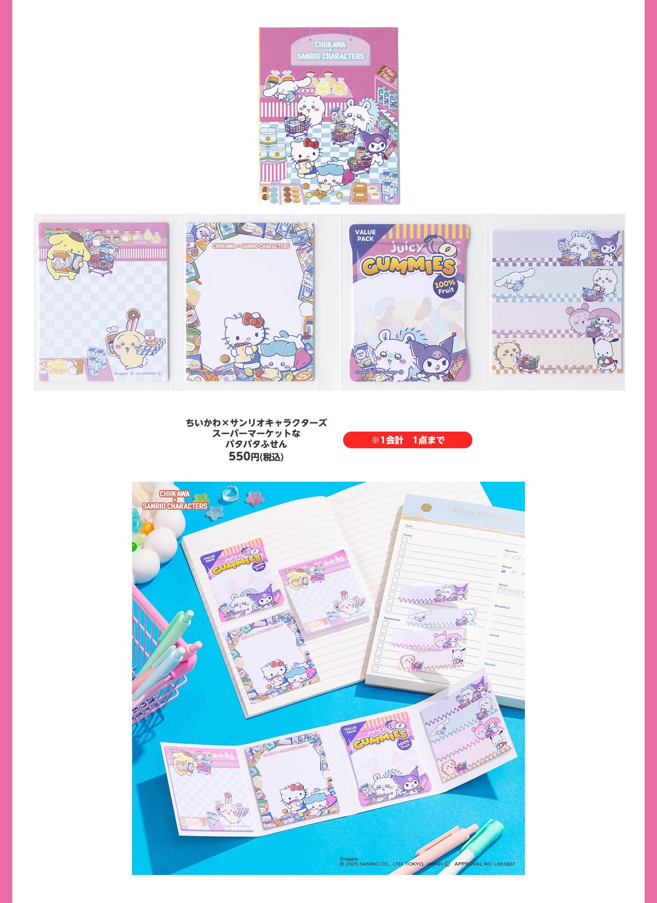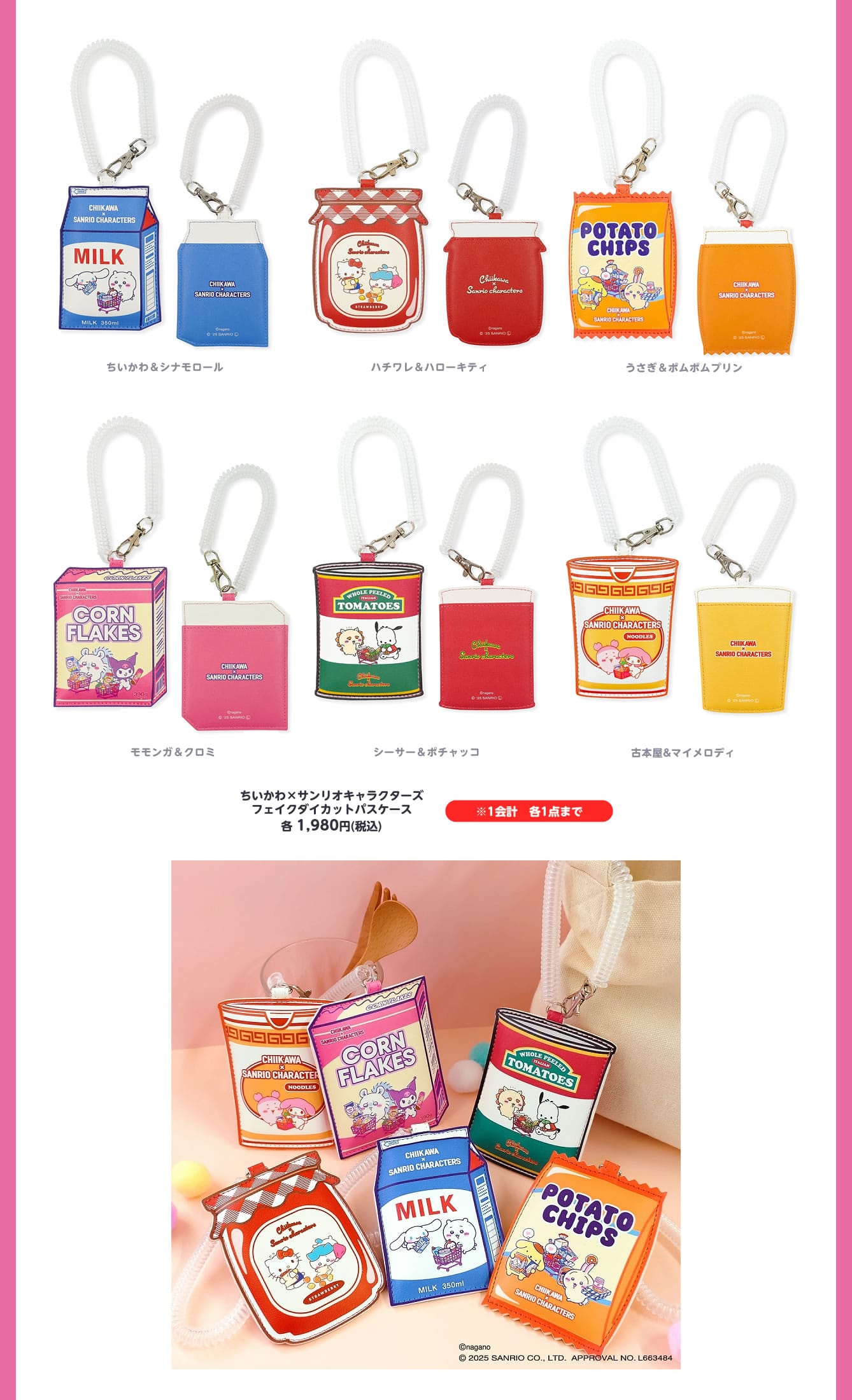 一緒にお買い物をするちいかわ・シナモン・ハチワレ・キティ・うさぎ・ポムポムプリン・モモンガ・クロミ・古本屋・マイメロディ・シーサー・ポチャッコのグッズが多数ラインナップ!