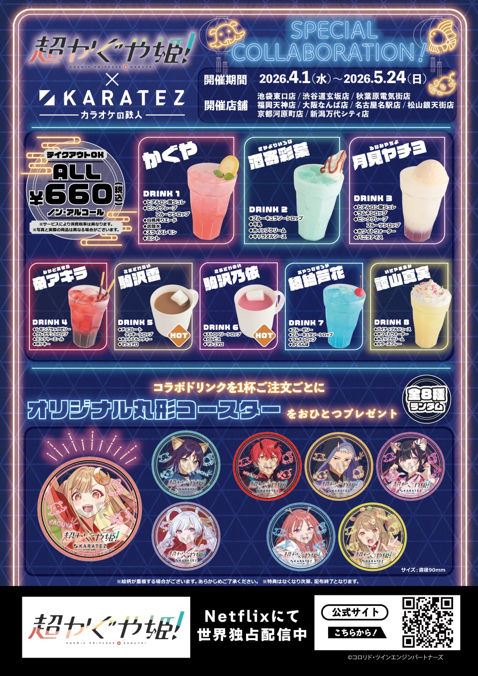 2026年4月1日より開催される「超かぐや姫! × カラオケの鉄人」コラボでは、かぐや・酒寄彩葉・月見ヤチヨらをイメージしたコラボドリンクが登場!