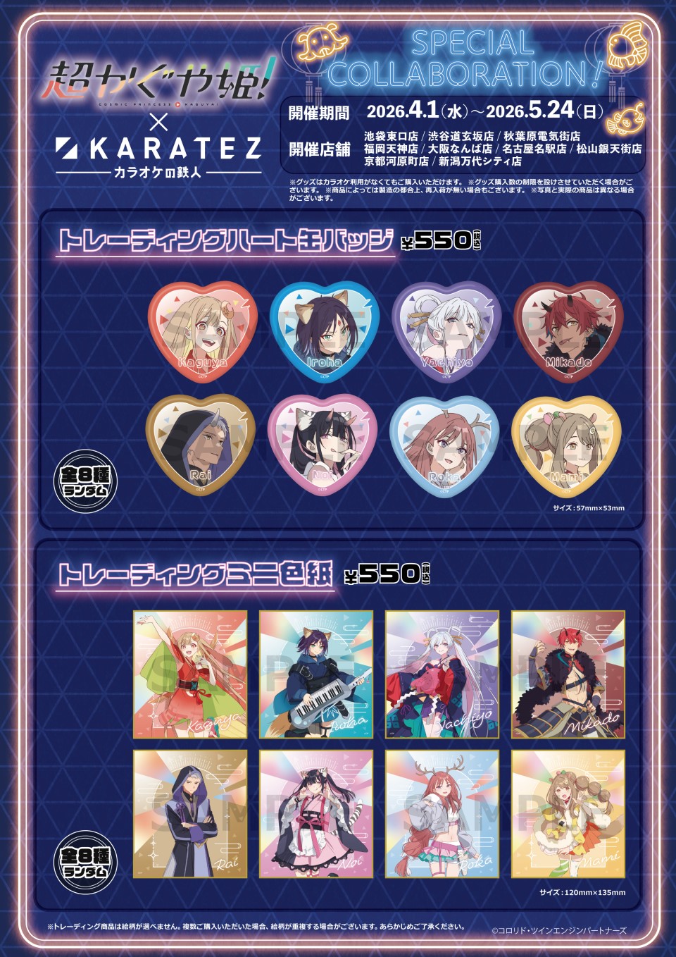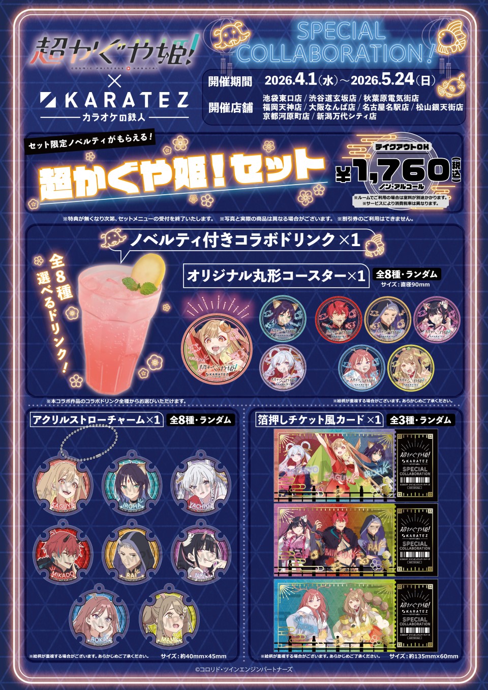 2026年4月1日〜5月24日までの期間限定でカラオケの鉄人にて開催される「超かぐや姫!」コラボでは「ハード缶バッジ」や「ミニ色紙」「ホログラムカード」などのコラボグッズが登場!