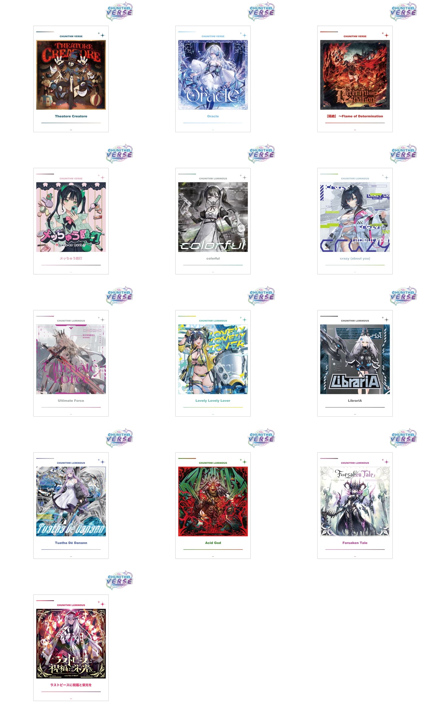 ■種類 : Theatore Creatore, Oracle, 〚隔絶〛 ~Flame of Determination, メッちゅう殴打, colorful, crazy (about you), Ultimate Force, Lovely Lovely Lover, LibrariA, Tuatha Dé Danann, Acid God, Forsaken Tale, ラストピースに祝福と栄光を