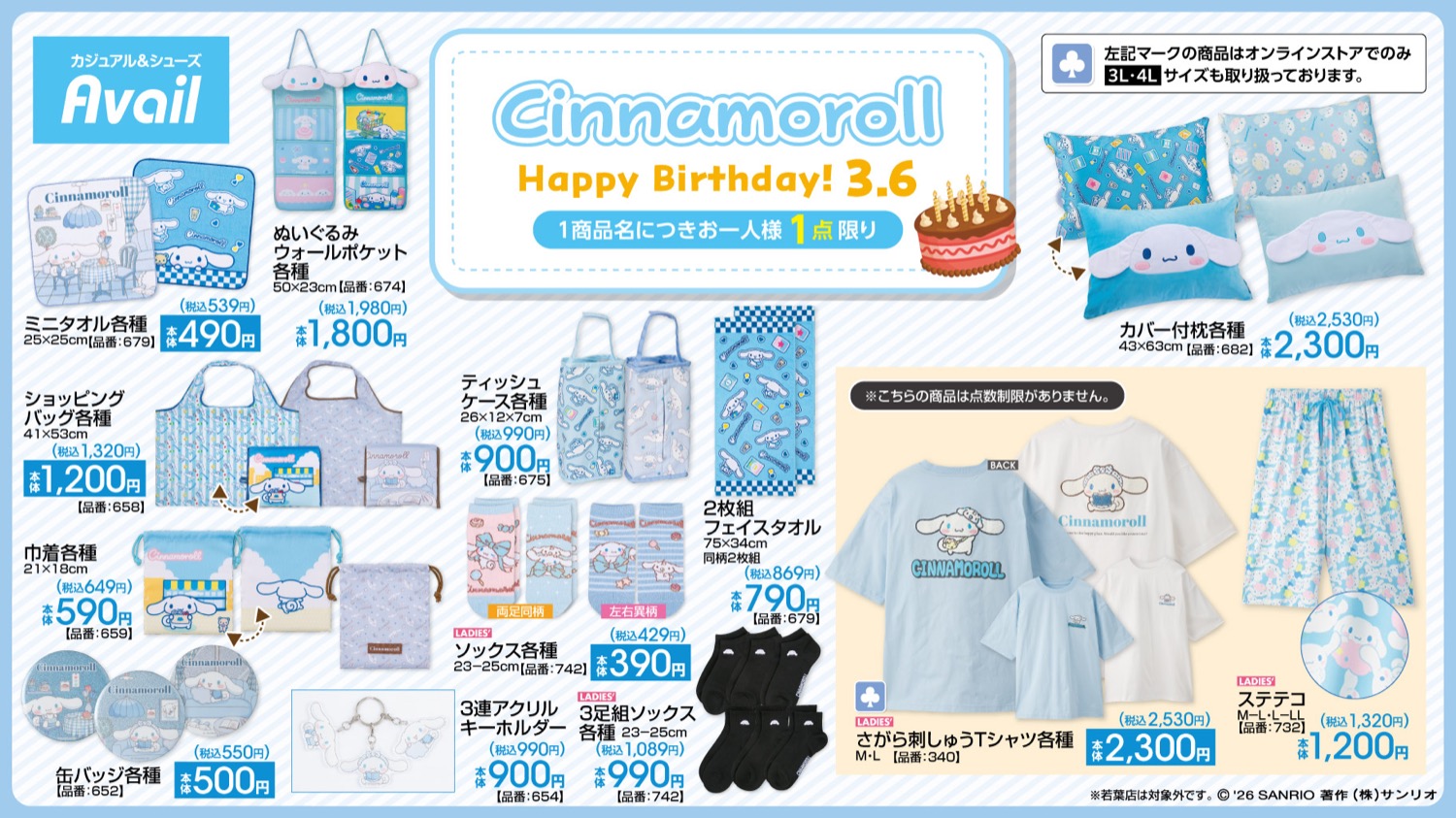世代を超えて愛されるサンリオの大人気キャラクター「シナモロール」× しまむらグループが展開するカジュアルブランド「Avail (アベイル)」全国にて、2026年2月28日より、シナモンのお誕生日を記念した新作アイテムが発売される。