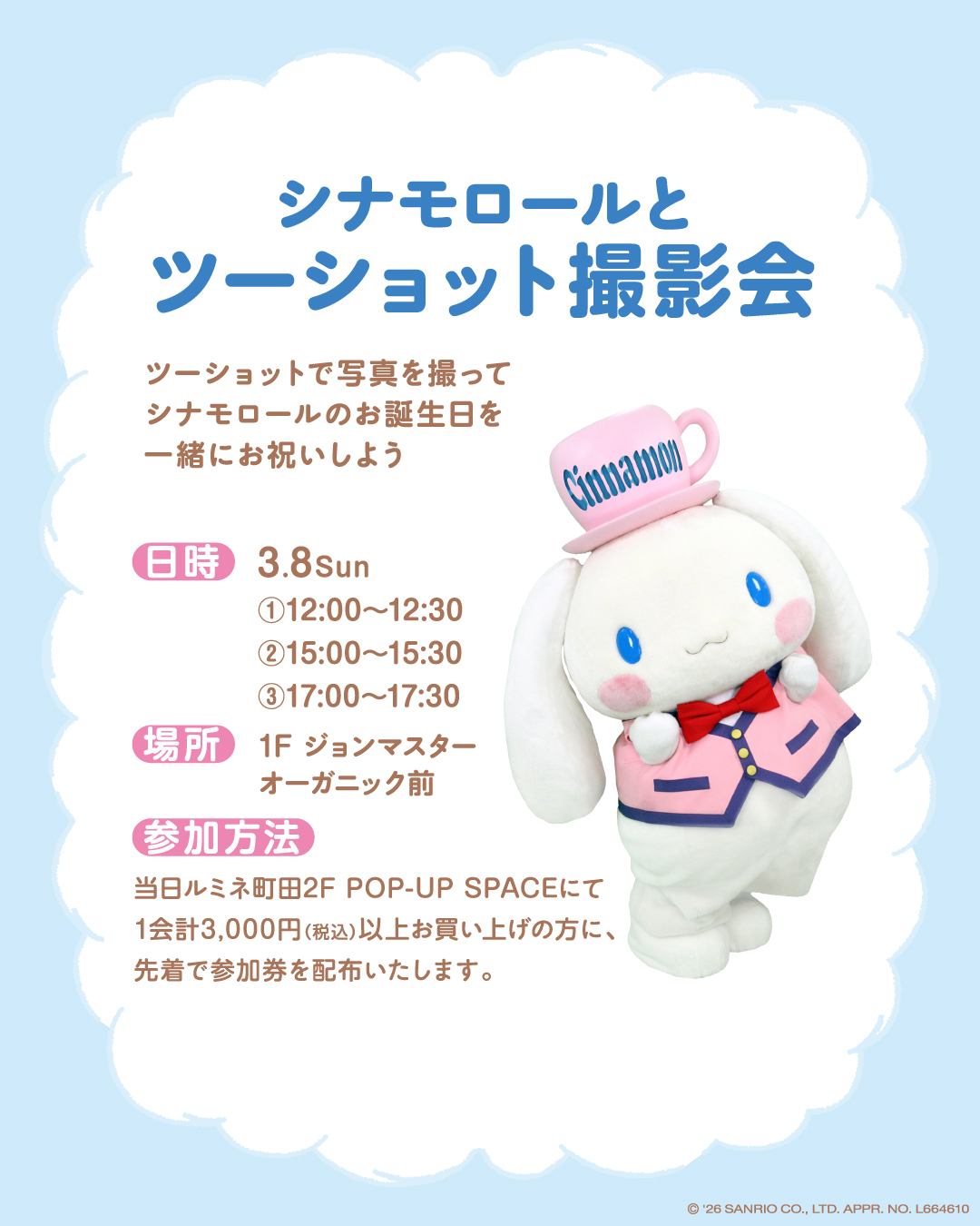 なお、3月8日は「ルミネ町田 Cinnamoroll Party POP-UP STORE」にて1会計3,000円(税込)以上ご購入すると、シナモンとのツーショット記念写真が撮れる参加券を先着で配布。