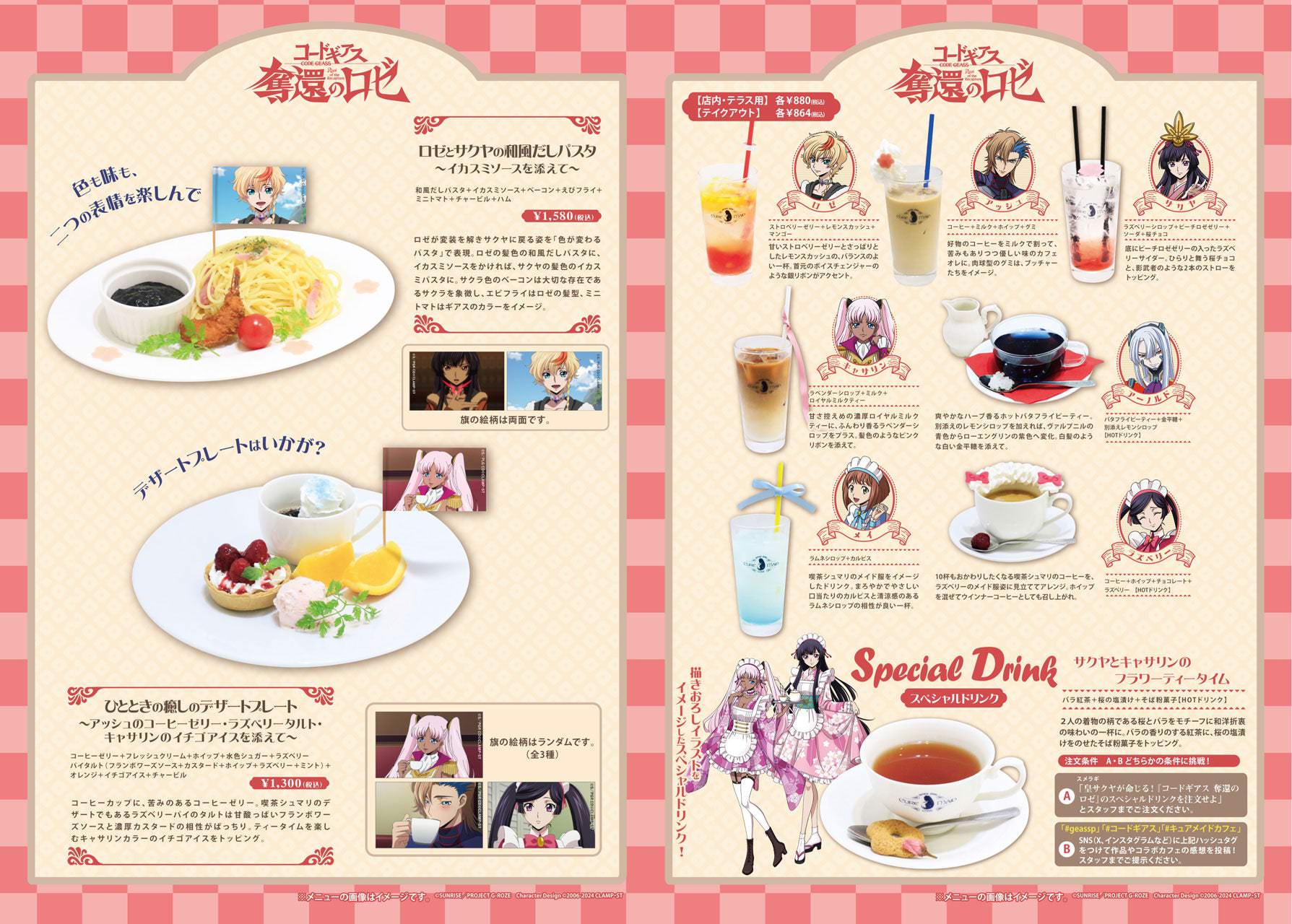 「コードギアス」コラボカフェでは、「コードギアス 反逆のルルーシュ」「コードギアス 奪還のロゼ」それぞれの作品の世界観やキャラクターをイメージしたコラボメニューがお楽しみいただける他、描き下ろしイラストを使用したコラボカフェ限定グッズが登場!