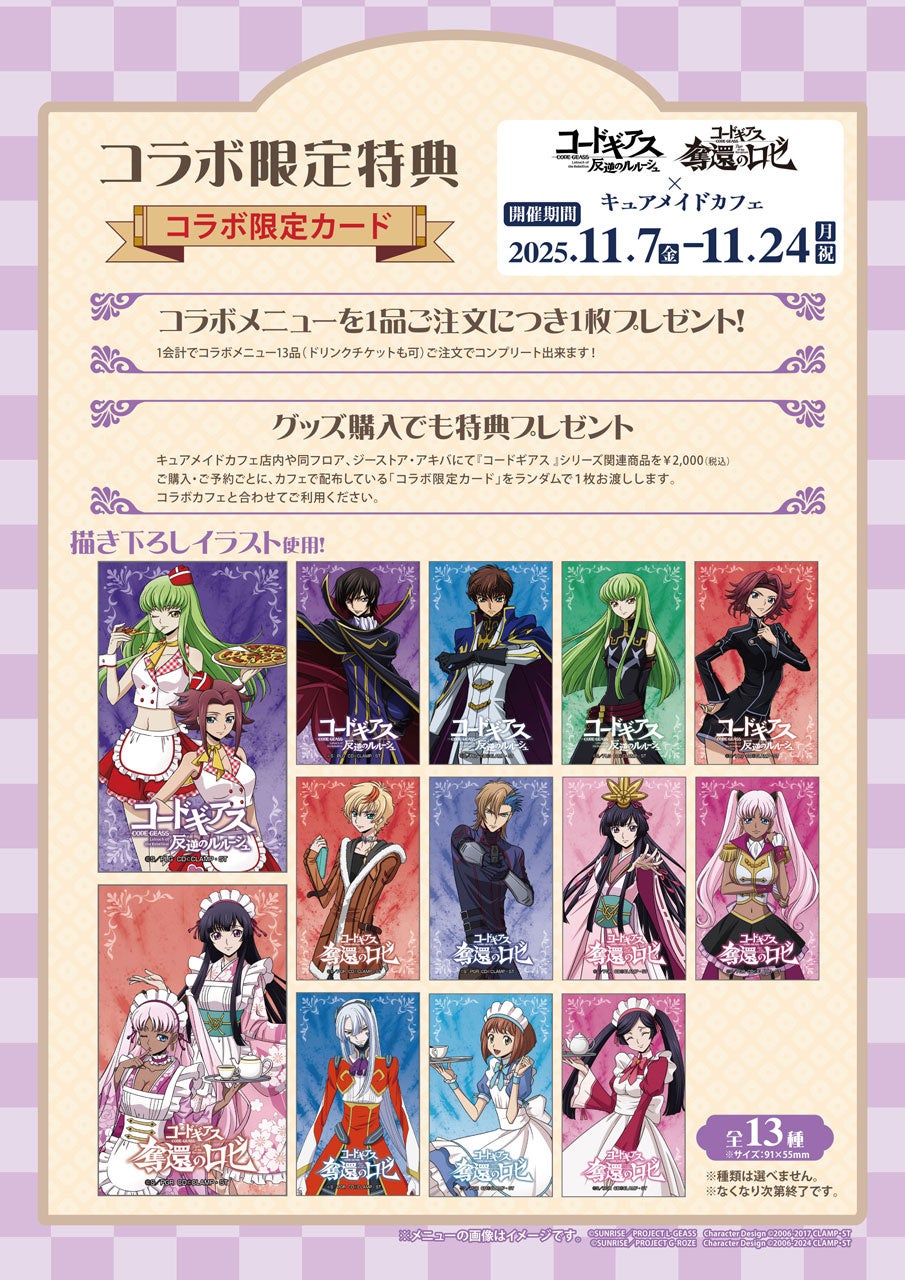 「コードギアス × キュアメイドカフェ」コラボにて、コラボメニューを1品ご注文につき1枚、キュアメイドカフェ店内や同フロア、ジーストア・アキバ、同ビル1階グランエンタスにて『コードギアス 』シリーズ関連商品を2,000円(税込)ご購入・ご予約ごとに1枚、「コラボ限定カード(全13種)」をランダムにプレゼント!