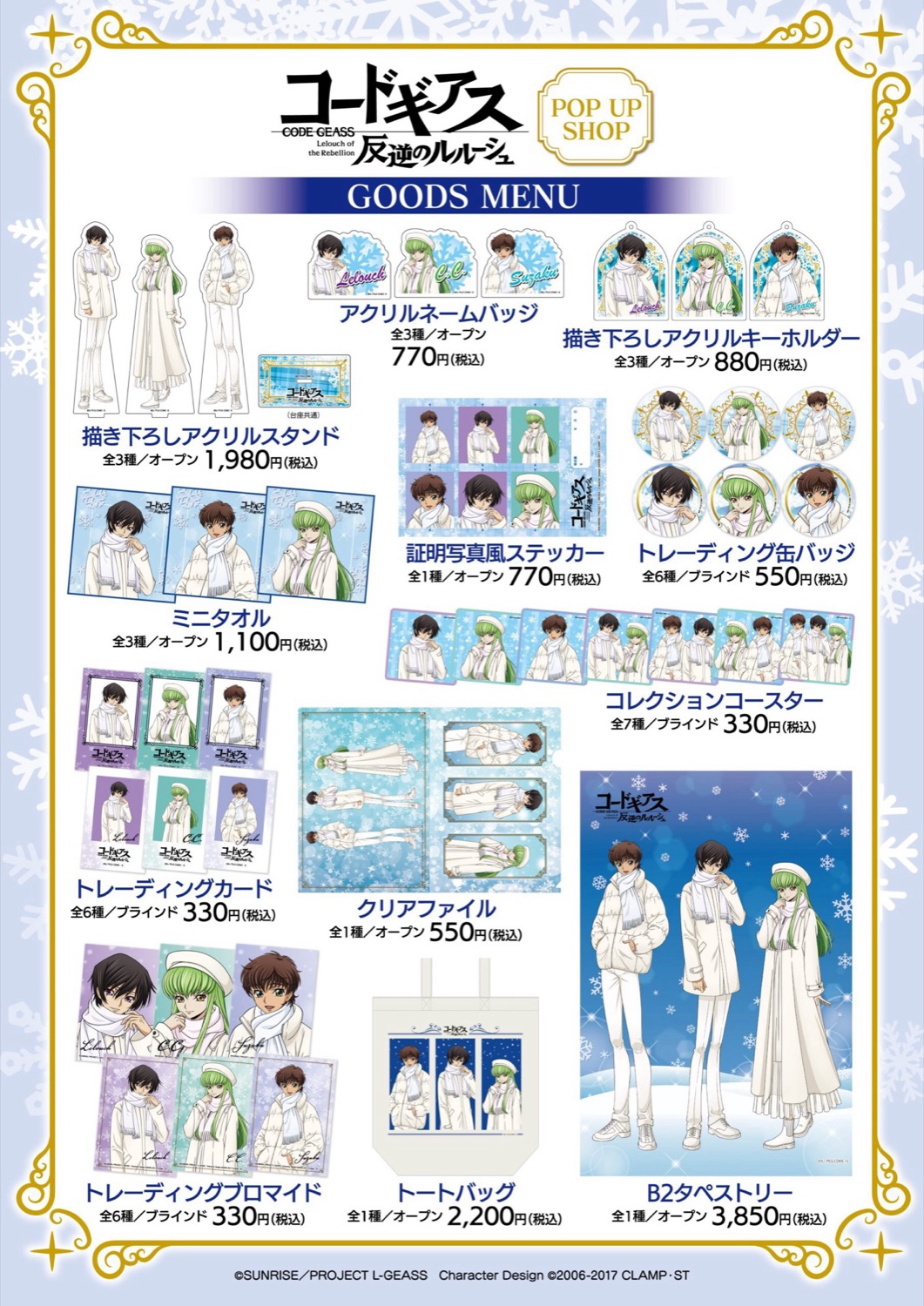アニメ「コードギアス 叛逆のルルーシュ」ポップアップストアでは、ルルーシュ・枢木スザク・C.C.たちがホワイトコーデで揃える、”ウィンター”イベント限定の描き下ろしイラストを使用した新作グッズが多数販売される。