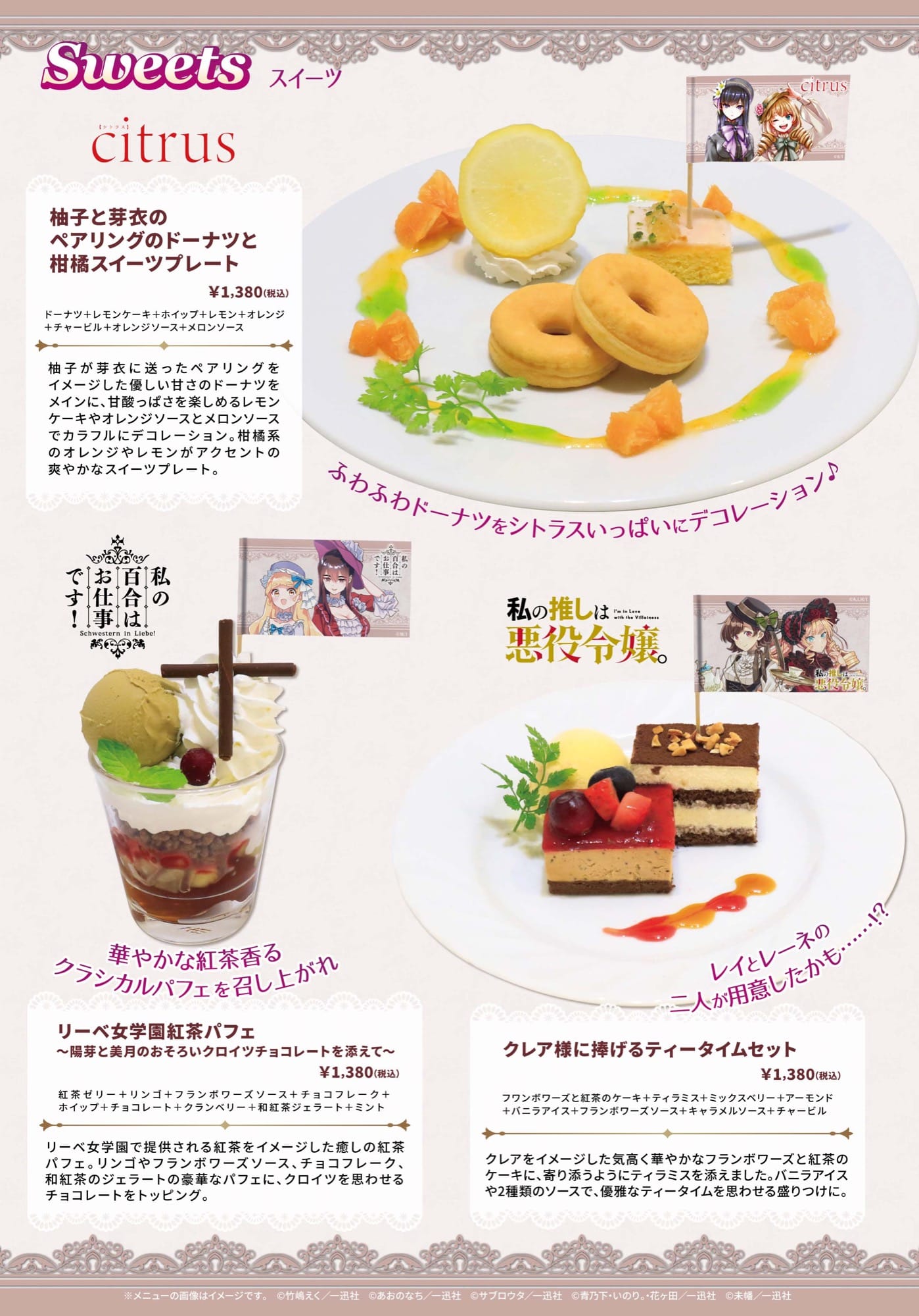 「ささやくように恋を唄う」「きみが死ぬまで恋をしたい」「私の推しは悪役令嬢。」「citrus」「私の百合はお仕事です!」といった人気作品をイメージしたコラボメニューを提供!