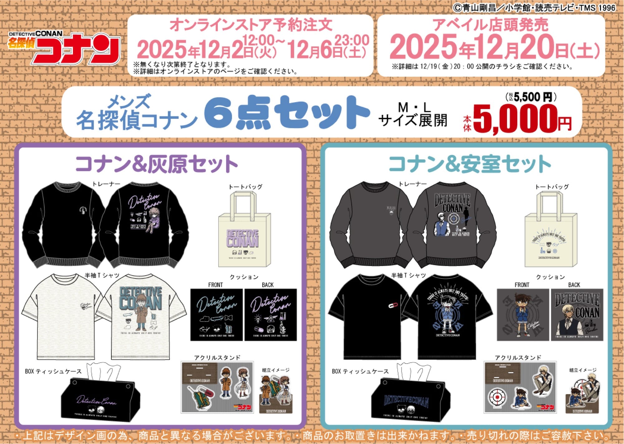 「名探偵コナン × アベイル」ハッピーバッグには、「コナングッズ7点セット」と、メンズ向けウェアが入った「コナン & 灰原 6点セット」「コナン & 安室 6点セット」がラインナップ。