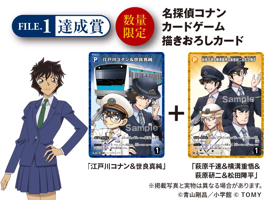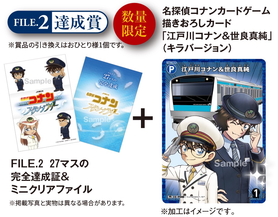 全27駅のスタンプをコンプリートした方には、「完全達成証 & ミニクリアファイル」と「名探偵コナン カードゲーム 描きおろしカード『江戸川コナン & 世良真純』(キラバージョン)」がプレゼントされる。