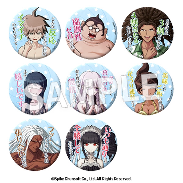 苗木誠、霧切響子、日向創、七海千秋、狛枝凪斗、最原終一、王馬小吉ら歴代人気キャラクターたちを描いた「セリフ缶バッジ」や「アクリルパズルコースター」が再登場。 イラストレーター・たま先生による描き起こしミニキャラグッズも必見。