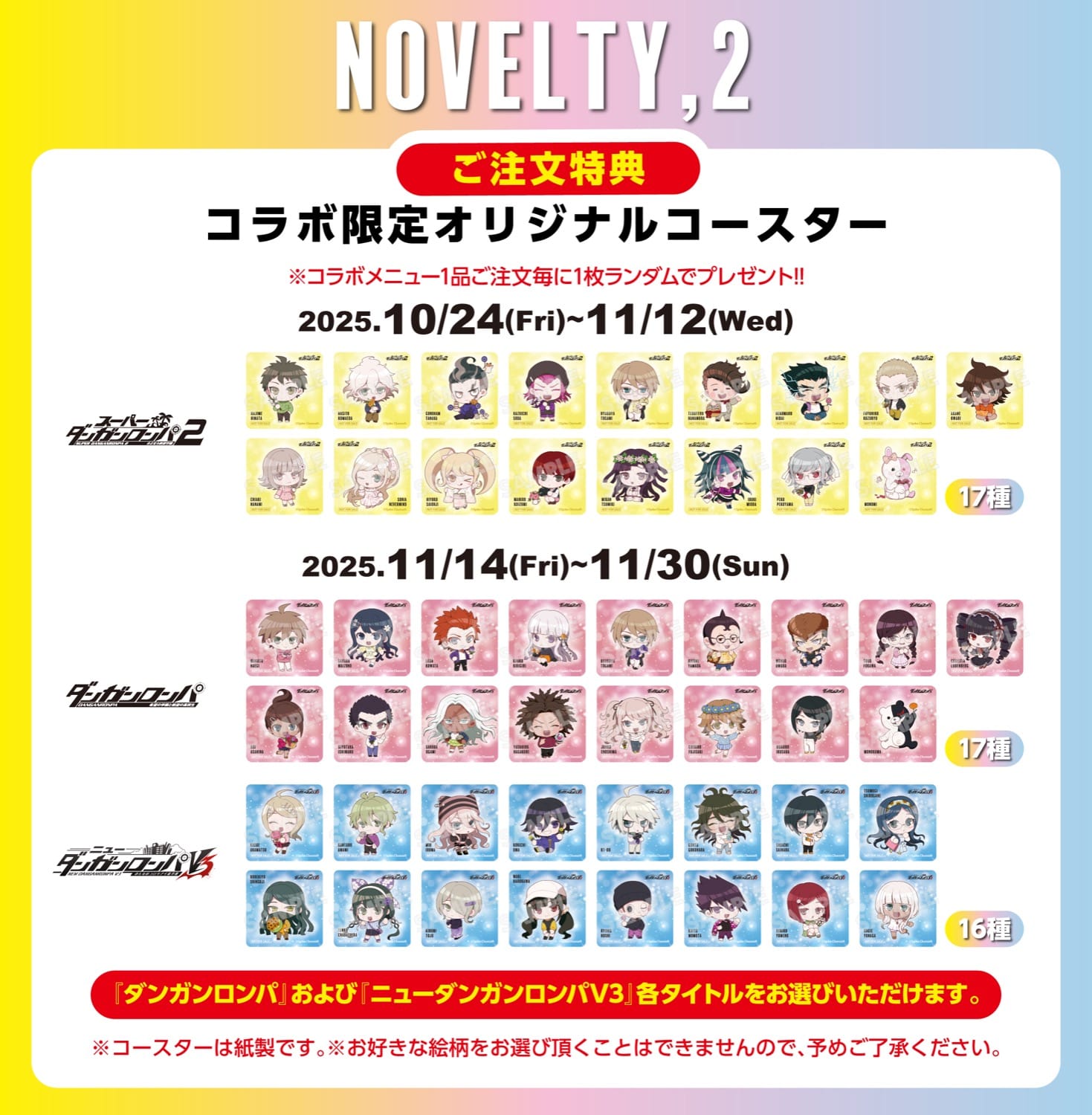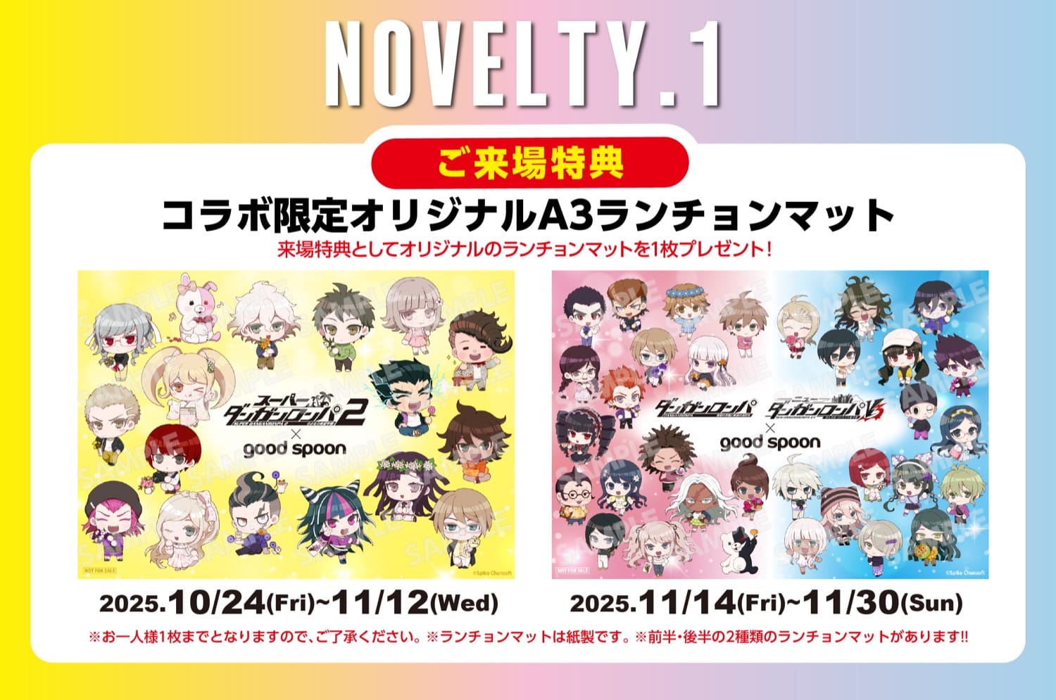 「ダンガンロンパ × good spoon 横浜・なんば」コラボでは、来場特典として「オリジナルA3ランチョンマット」を1枚、コラボメニューを注文すると特典として「オリジナルコースター」をランダムに1枚プレゼント!