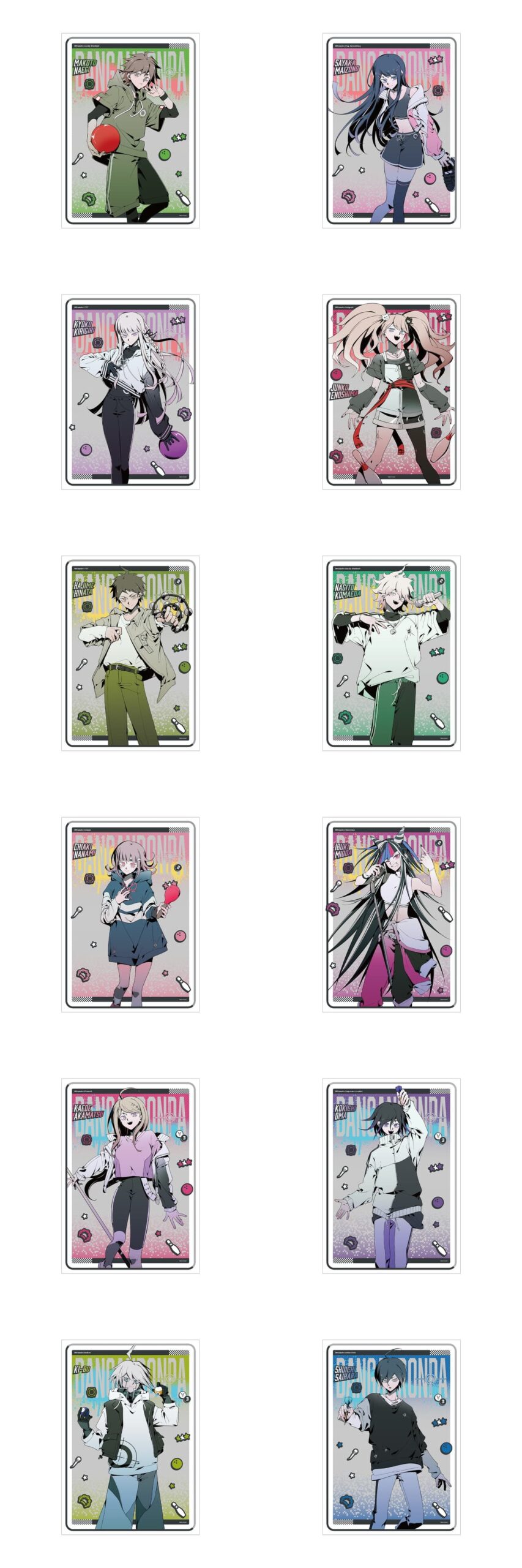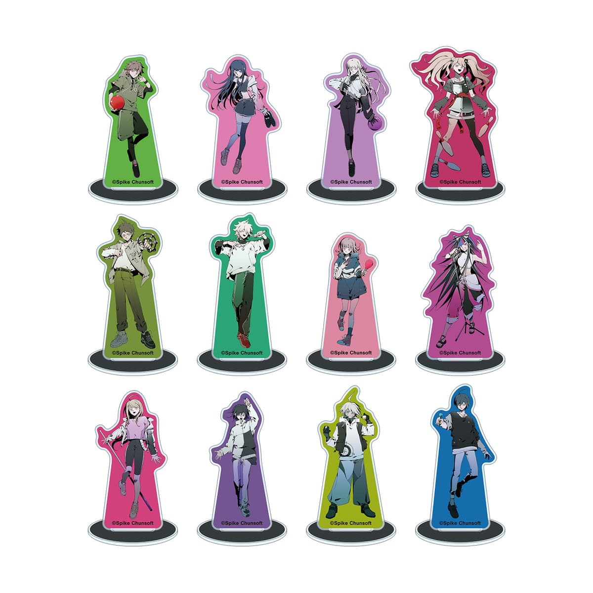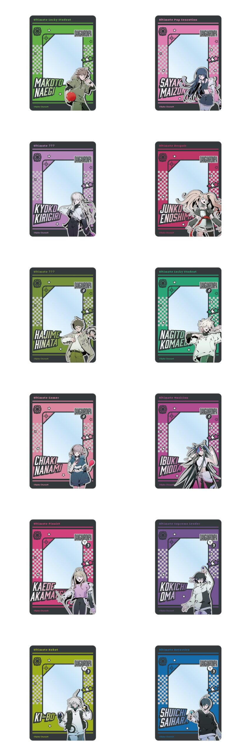 キャラクターラインナップは、苗木誠、舞園さやか、霧切響子、江ノ島盾子、日向創、狛枝凪斗、七海千秋、澪田唯吹、赤松楓、王馬小吉、キーボ、最原終一の12人。