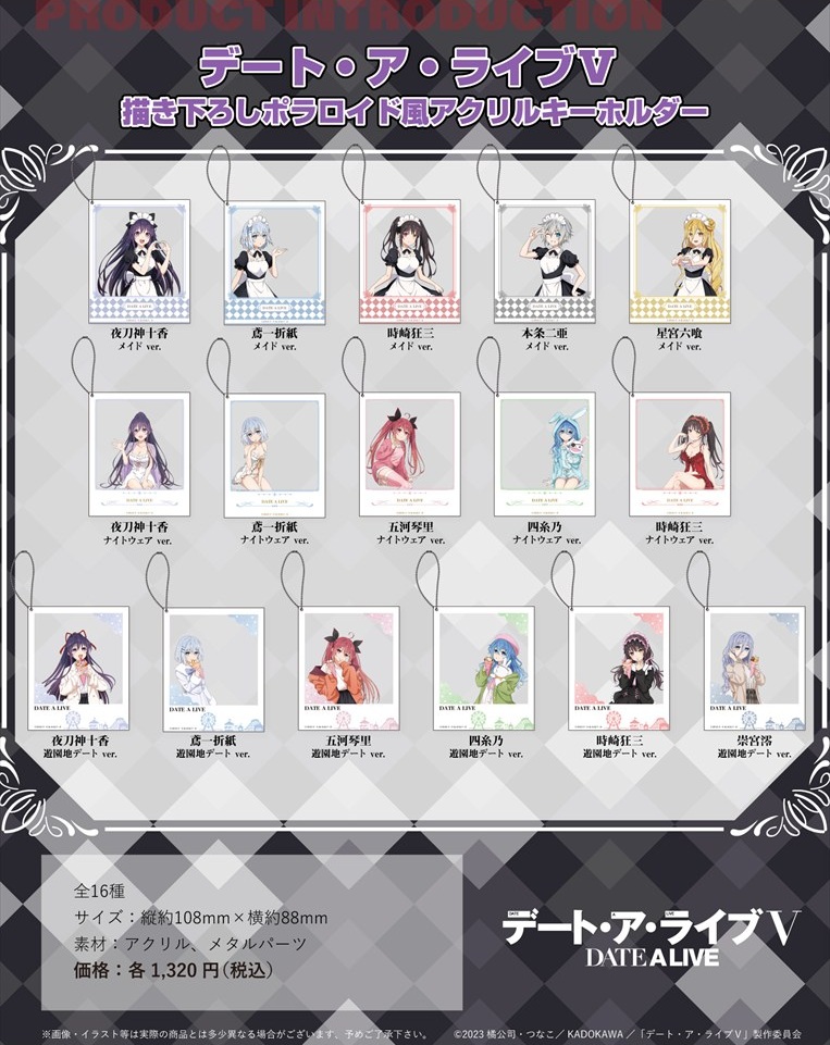 十香や狂三らを描いた「ダイカットステッカー」「アクリルカード」「ポラロイド風アクリルキーホルダー」など全部で3種類がラインナップ。 過去のポップアップストアにて好評を博した、オタ活にもぴったりなデアラグッズを是非お迎えください。