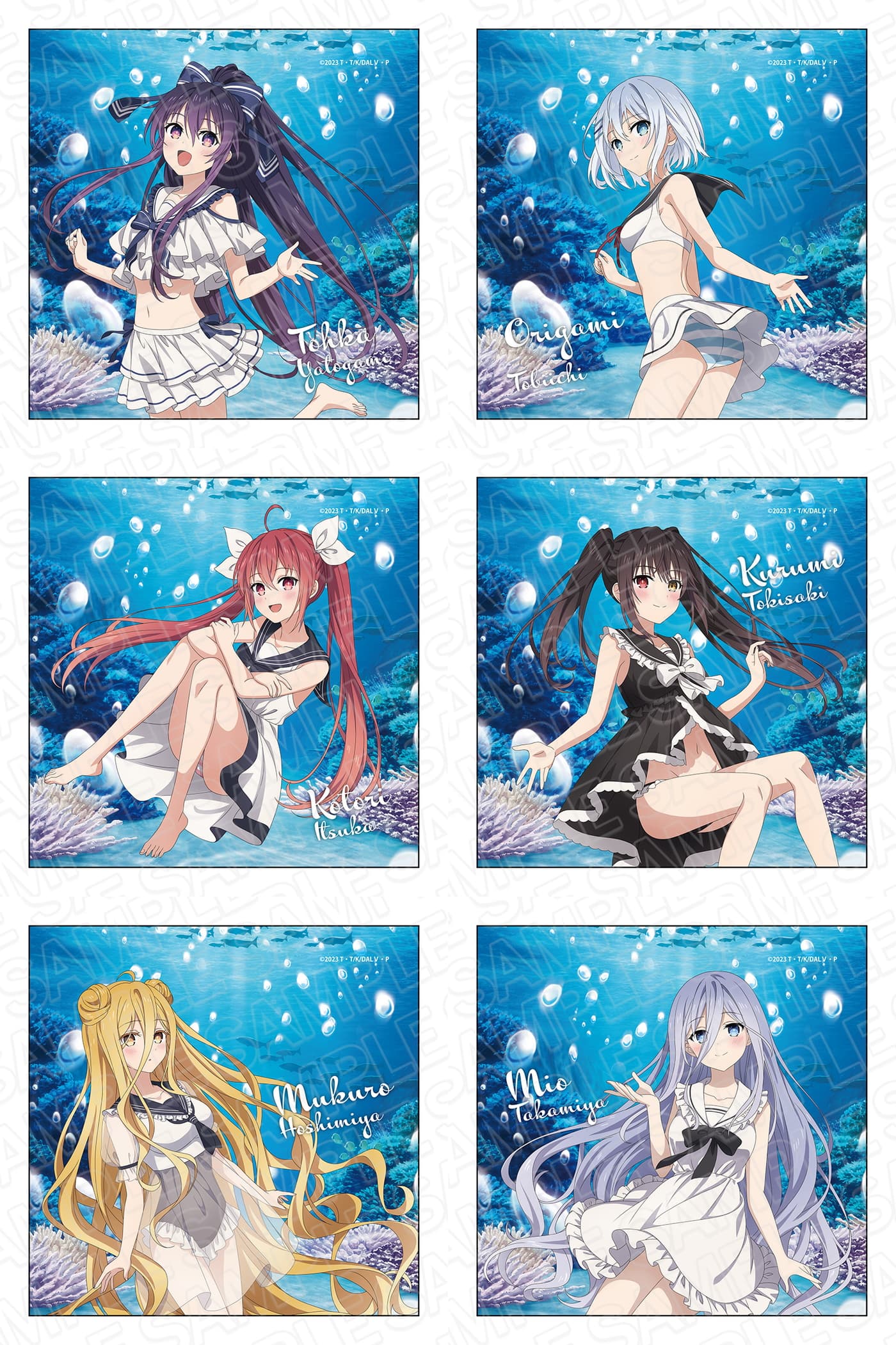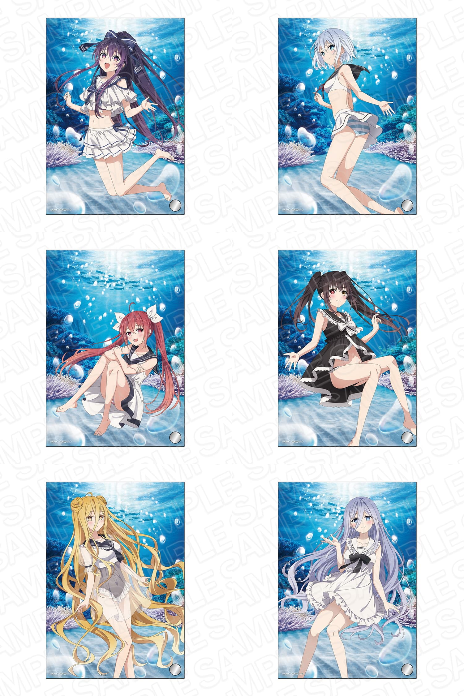 “マリンver.”の描き下ろしイラストでは、夜刀神十香、時崎狂三、鳶一折紙、五河琴里、星宮六喰、崇宮澪の6人の精霊が、白と黒を基調にしたマリンテイストの水着姿で登場。