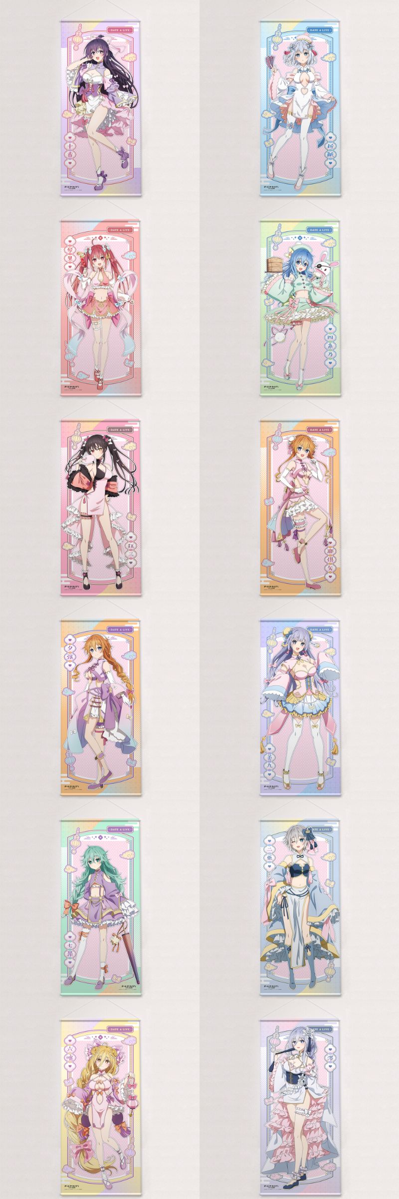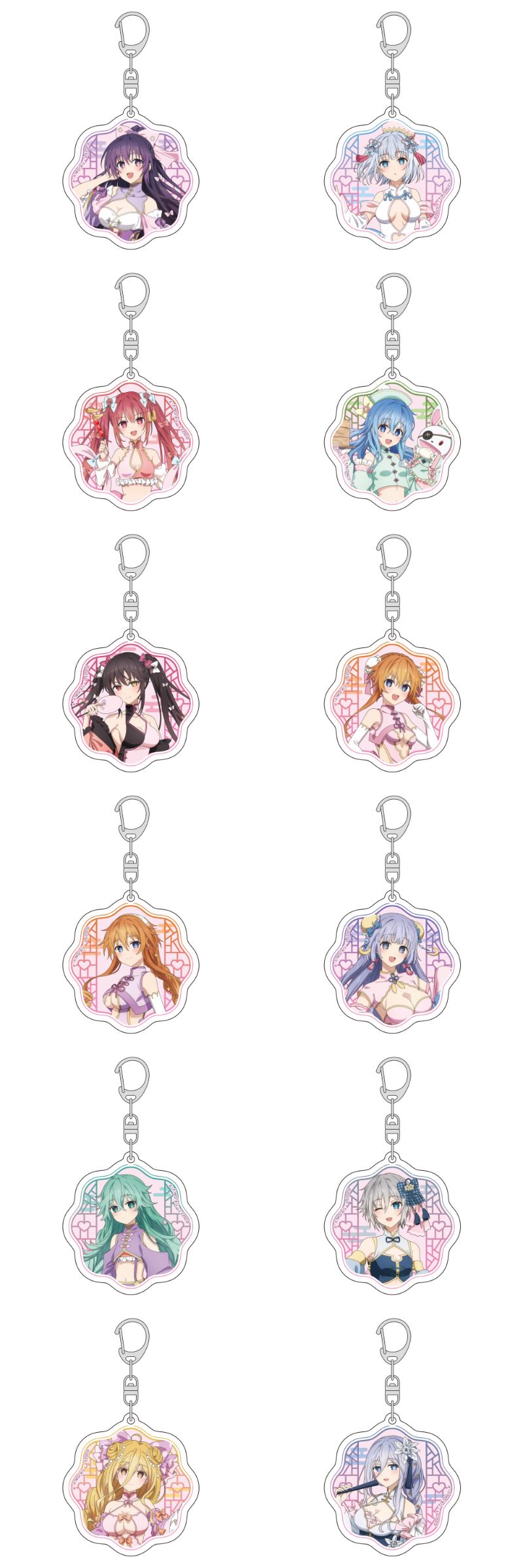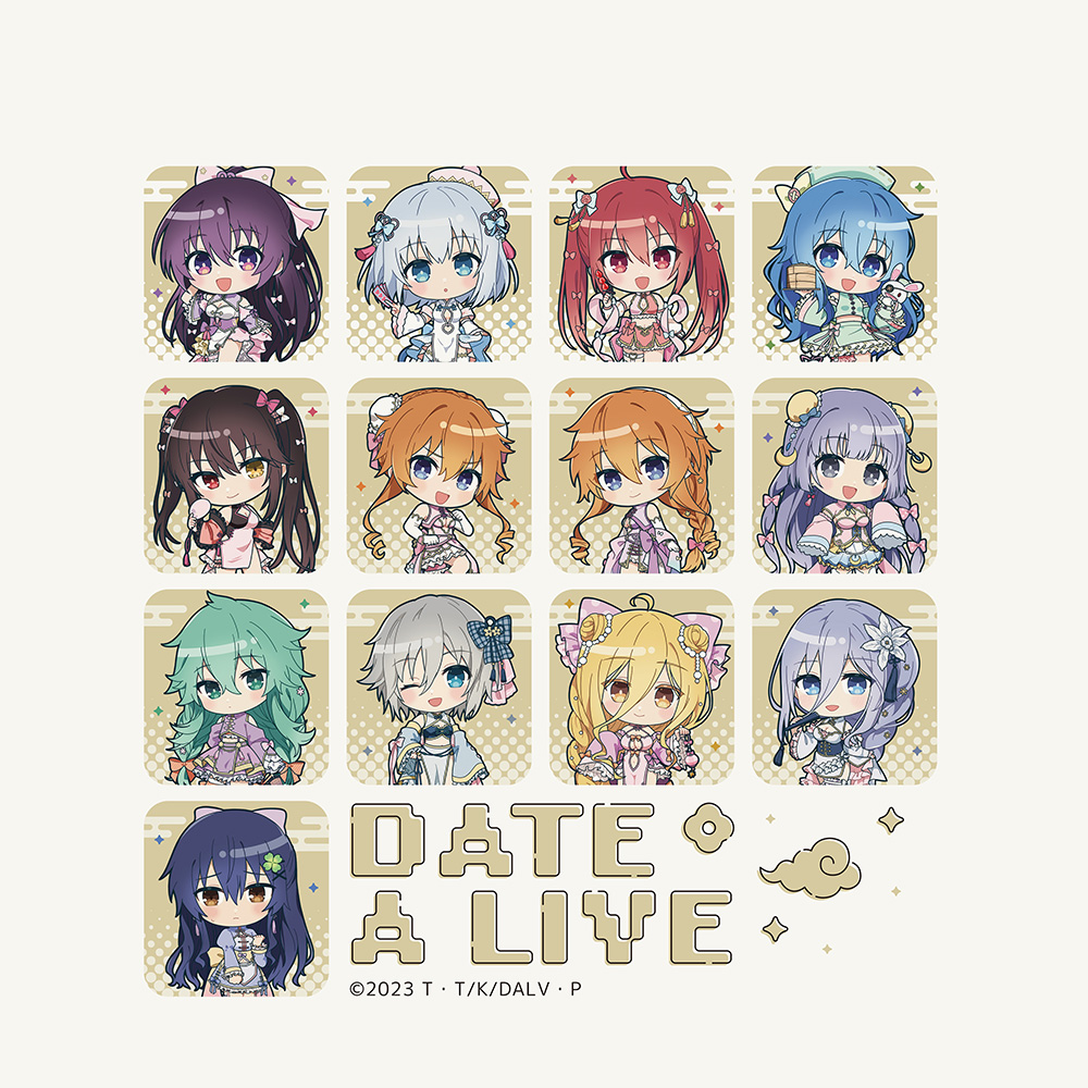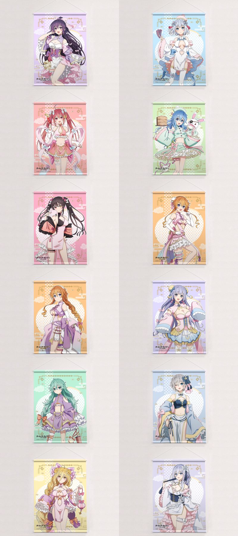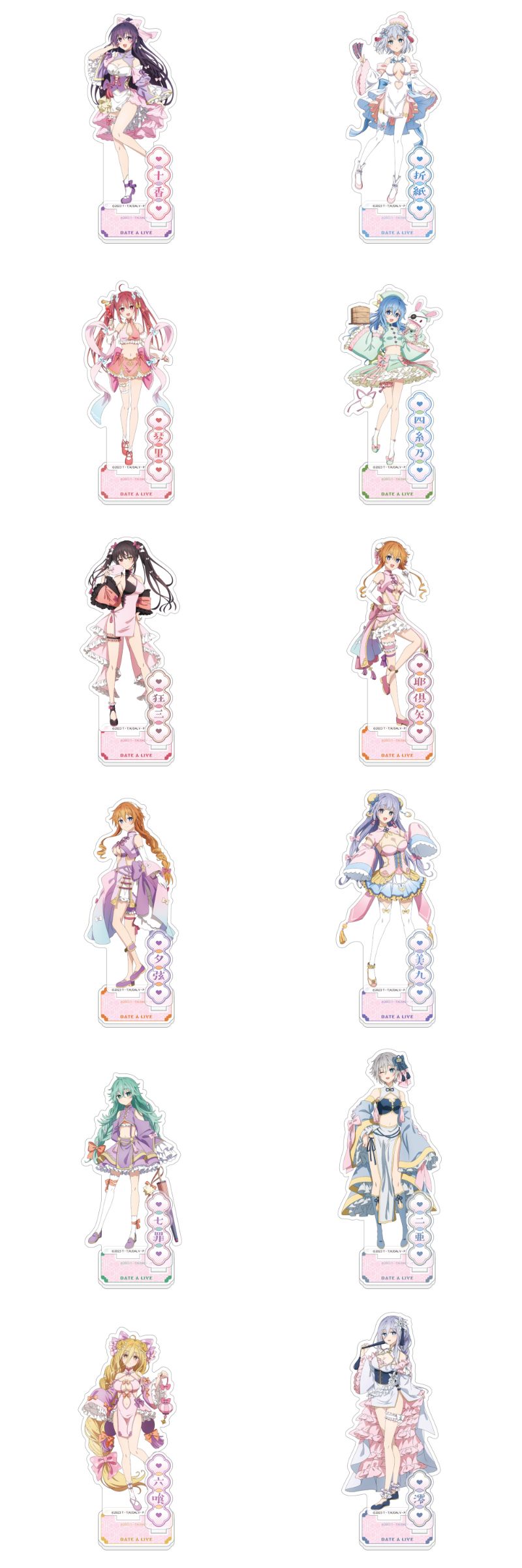パステルカラーのチャイナ衣装に身を包んだ、夜刀神十香、鳶一折紙、五河琴里、四糸乃、時崎狂三らヒロイン12人を描いた「トレーディング缶バッジ」や「アクリルスタンド」、「B2 & 特大タペストリー」など全11種がラインナップ。