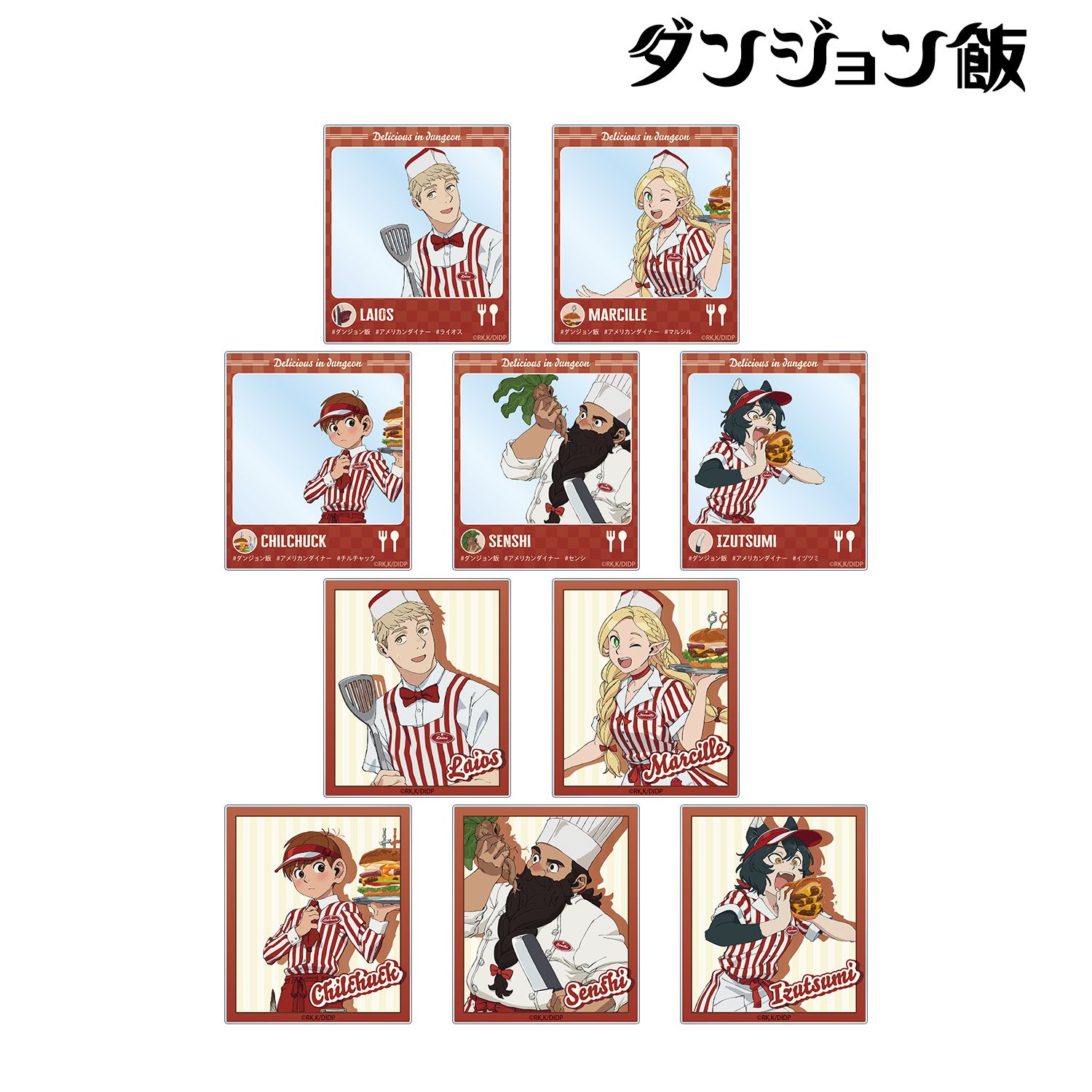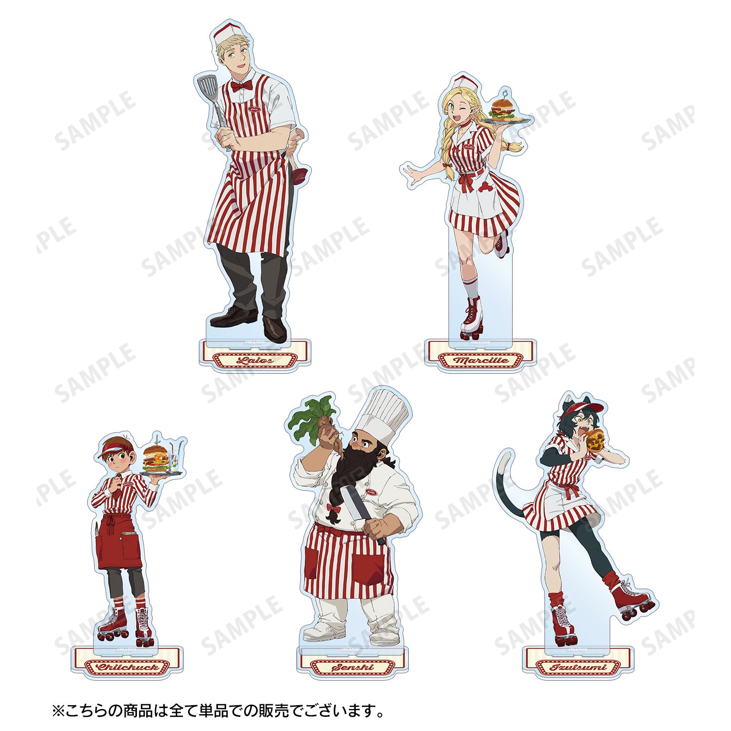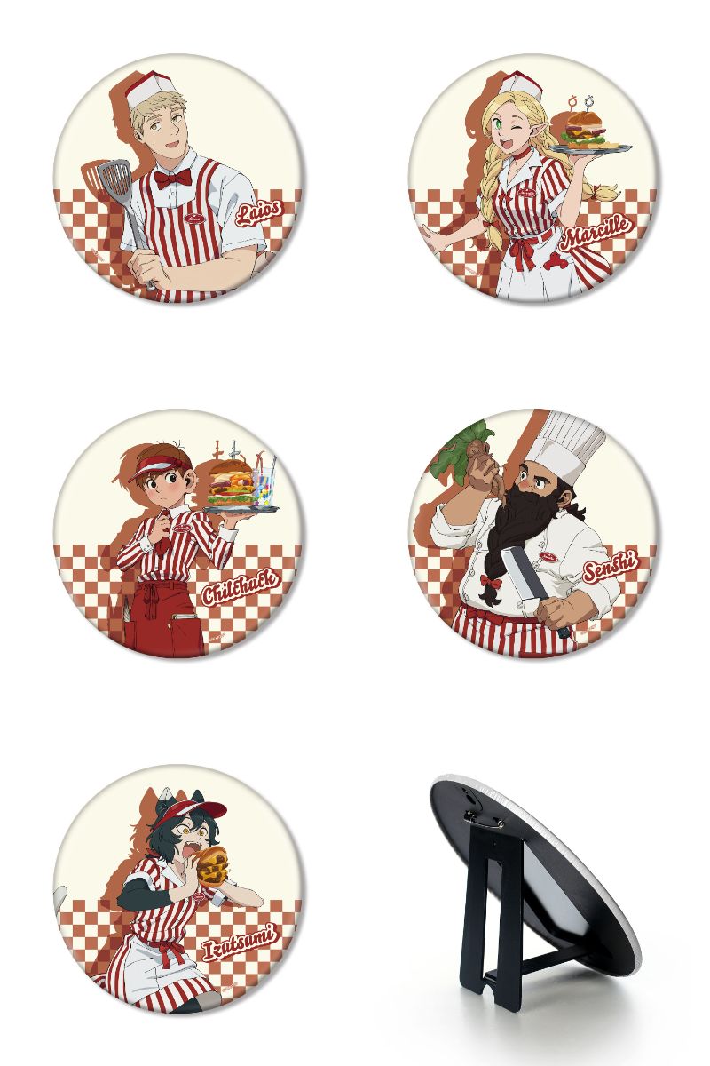 ダイナー風衣装に身を包んだ、ライオス、マルシル、チルチャック、センシ、イヅツミらライオス一行を描いた「缶バッジ」「アクリルカード」「BIG缶バッジ」「BIGアクリルスタンド」など全7種がラインナップ。