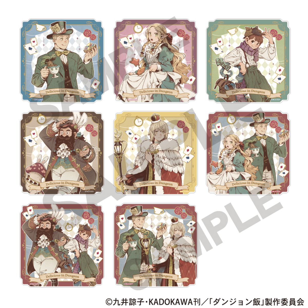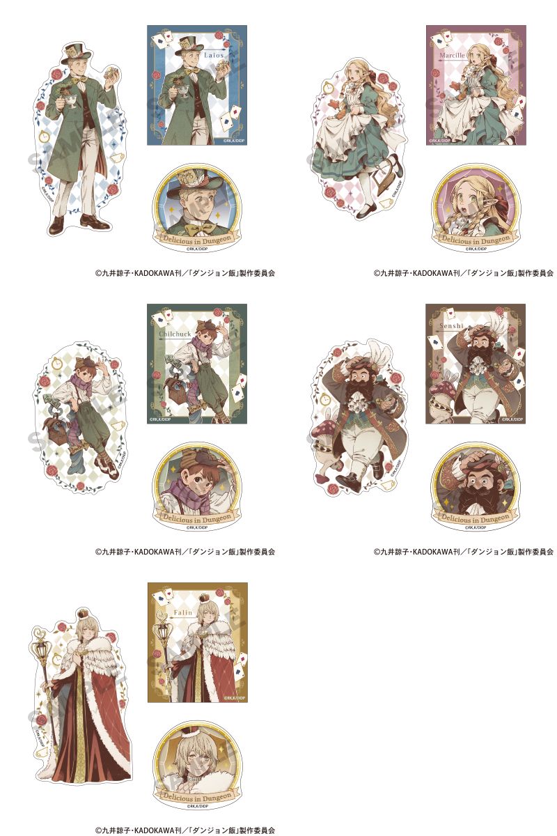 ライオス一行が、不思議の国のアリス風衣装に身を包んだ描き下ろしイラストを使用した「トランプ風両面アクリルキーホルダー」「額縁風箔押しアクリルスタンド」「本型アクリルクリップ」など全7種がラインナップ。