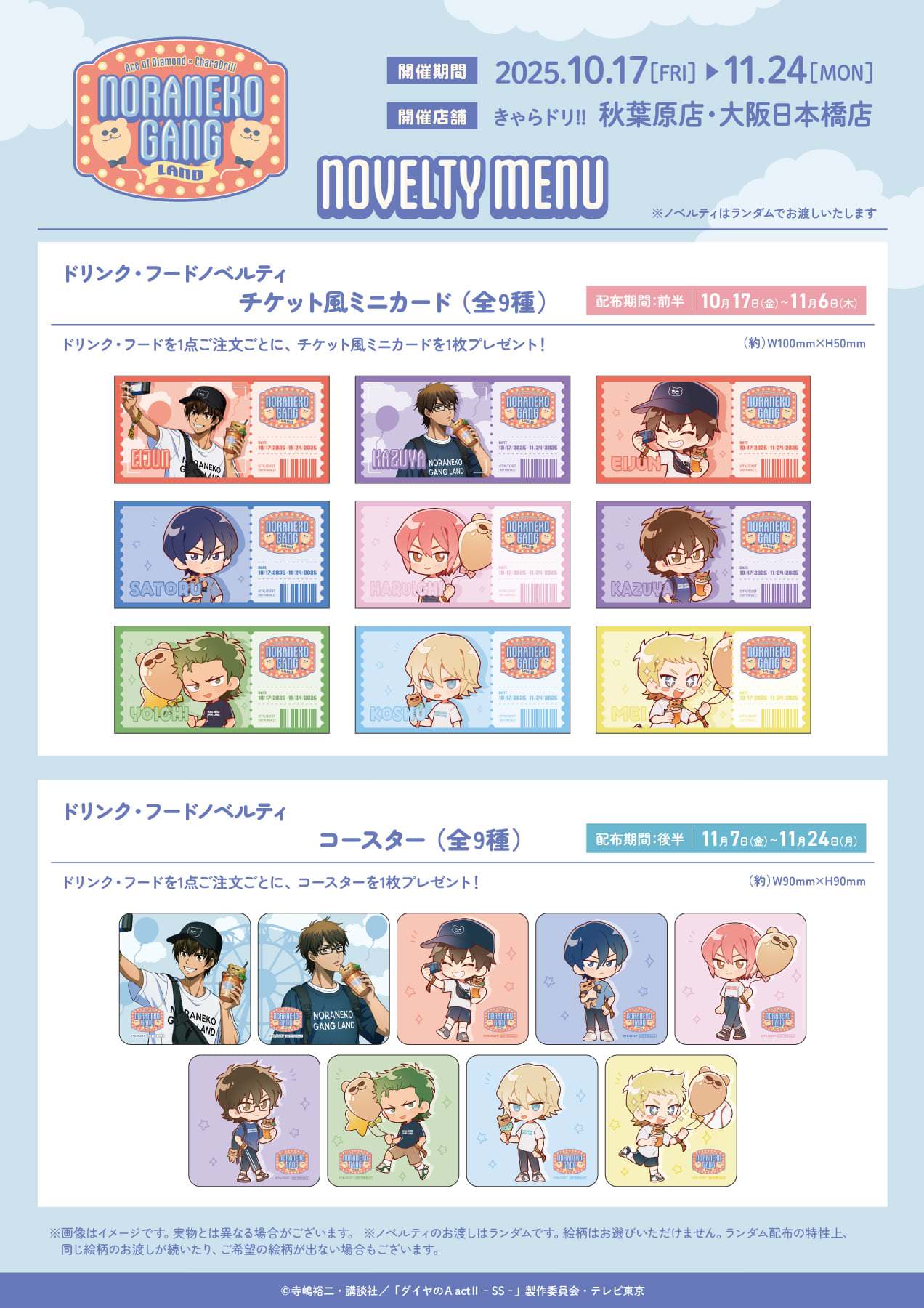 「ダイヤのA × きゃらドリ!! 秋葉原/大阪日本橋」コラボにて、コラボメニューを注文すると特典として「チケット風ミニカード (全9種)」や「コースター (全9種)」をランダムに1枚プレゼント!