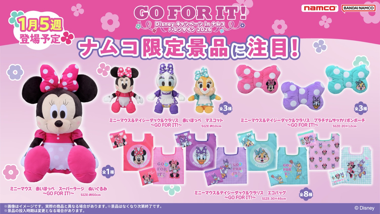 「ディズニー × ナムコ全国」では、ミニーマウス・デイジーダック・クラリスのナムコ限定景品が登場するほか、クレーンゲーム機のプレイ特典、ナムコポイントアプリの店舗フォローキャンペーンなどを実施!
