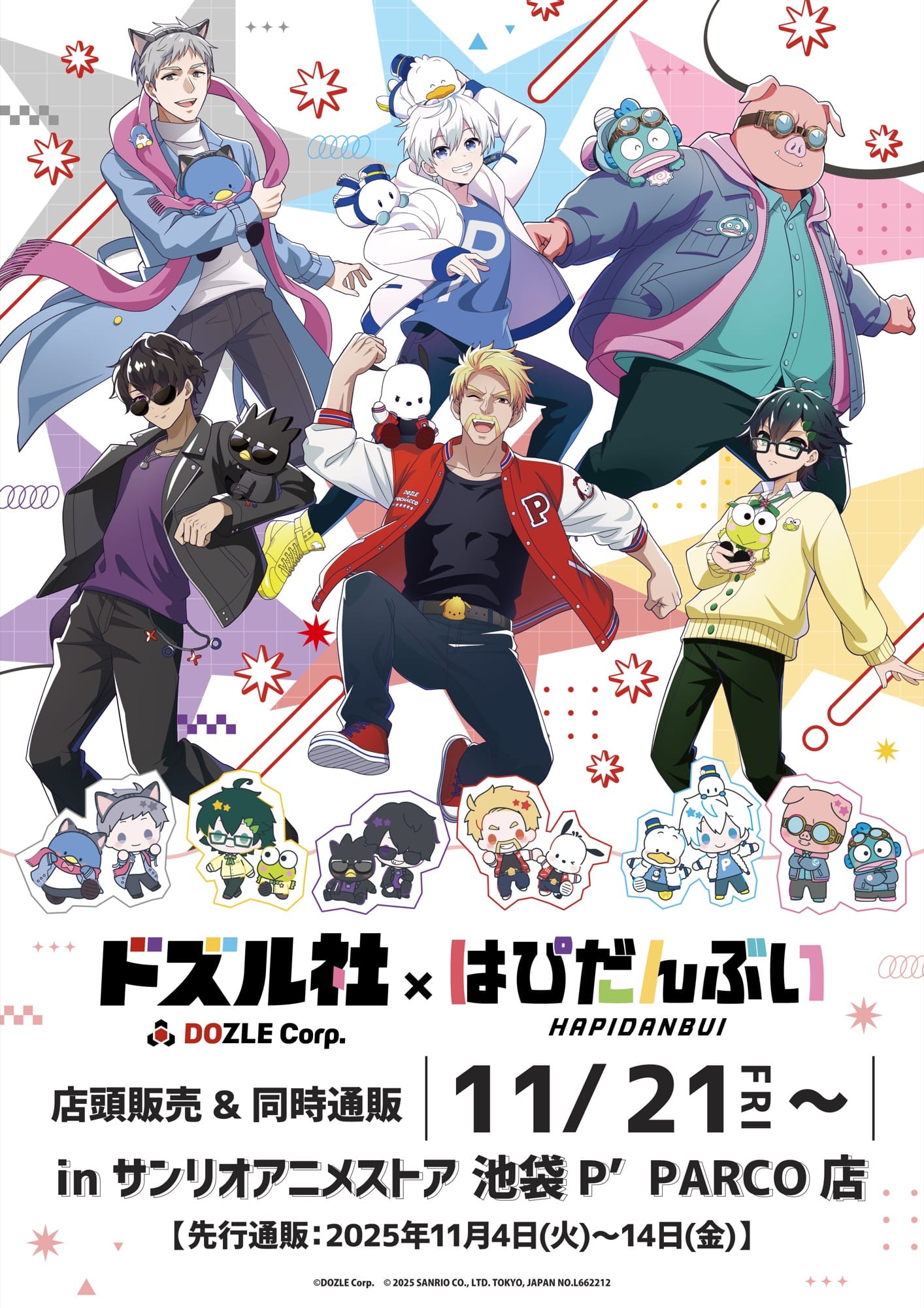 マインクラフトの動画などで人気のゲーム実況者YouTuberグループ「ドズル社」× 世代を超えて愛されるサンリオより、男のコたち6人組の大人気ユニット「はぴだんぶい」のポップアップストアが、サンリオアニメストア池袋P’PARCOにて2025年11月21日より開催される。