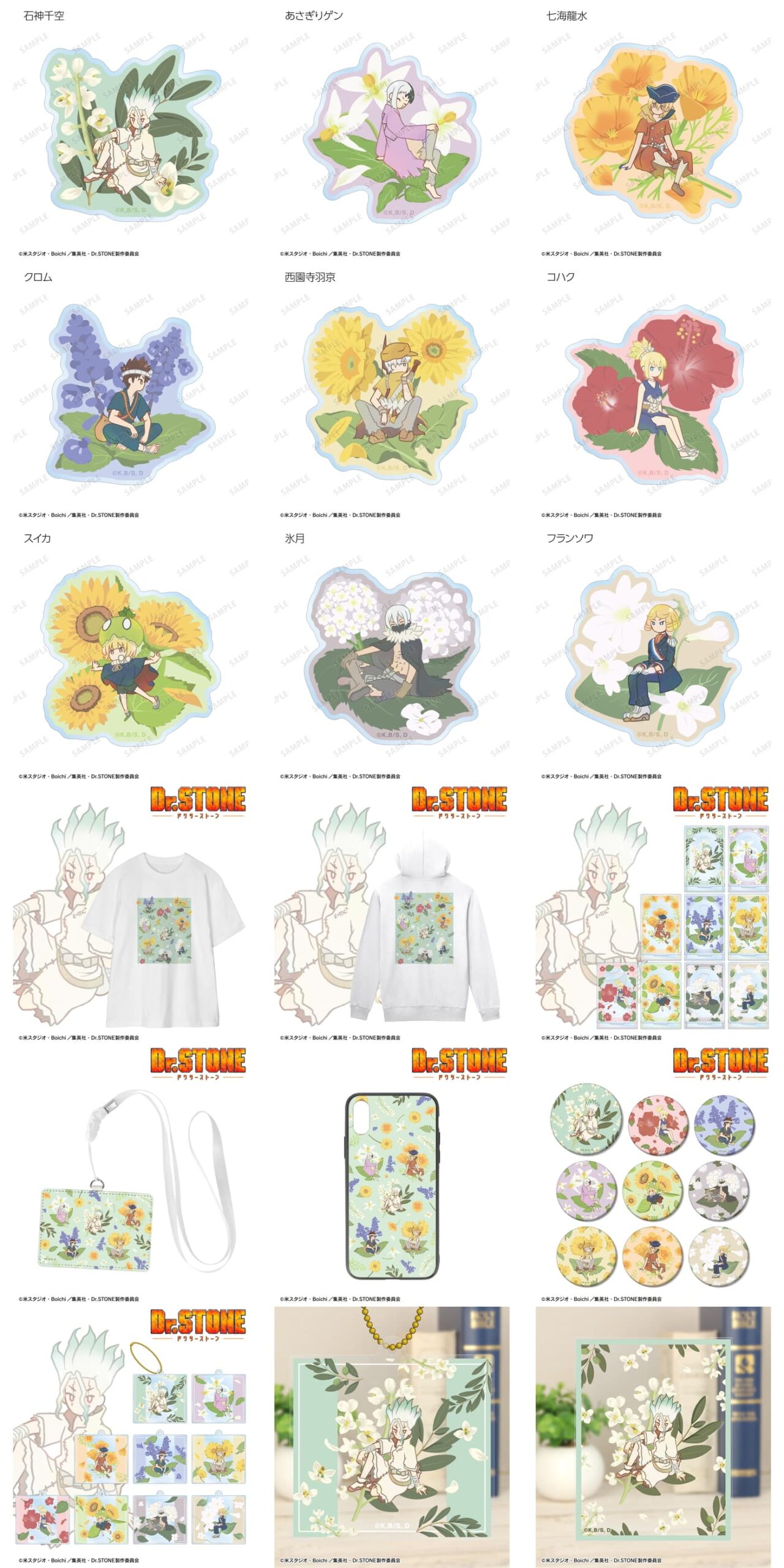 石神千空たちの名セリフをデザインしたTシャツをはじめ、石化前ver.や怪盗団ver.の描き下ろしイラストを使用したグッズ、さらにBotania、Ani-Artなどの多彩なアイテムが登場する。