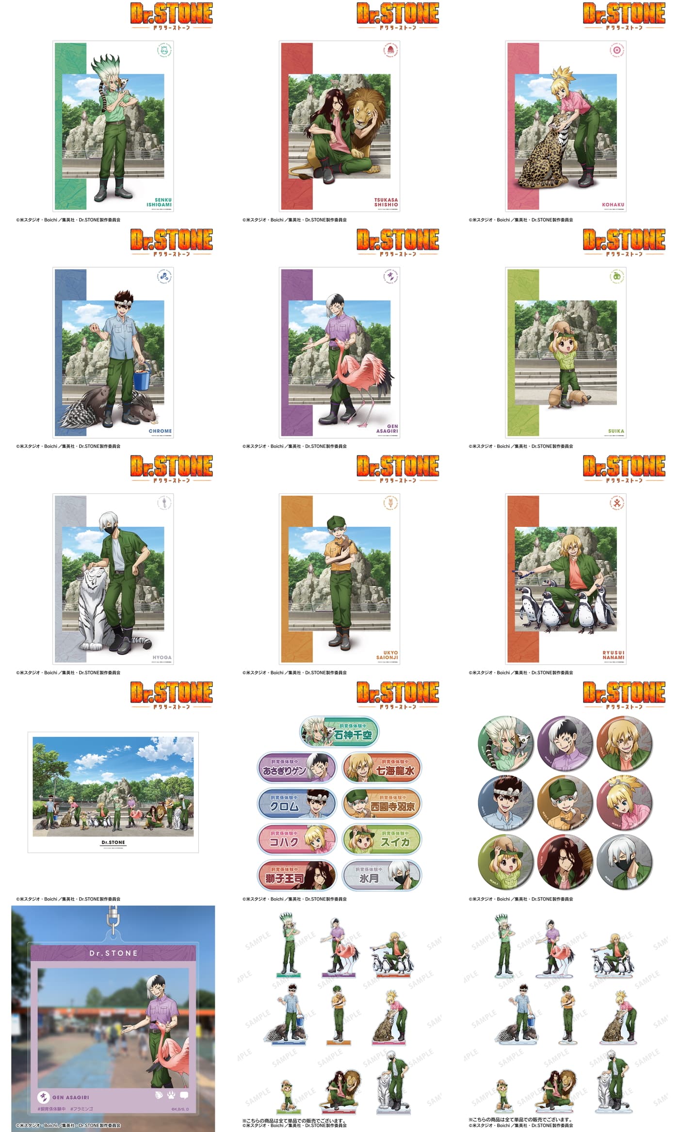 アニメ「Dr.STONE」×「東武動物公園」コラボで登場した、石神千空・あさぎりゲン・七海龍水・クロム・西園寺羽京・コハク・スイカ・獅子王司・氷月の描き下ろしグッズやミニキャラグッズが再登場!