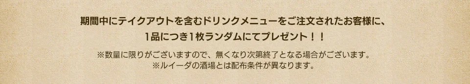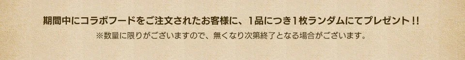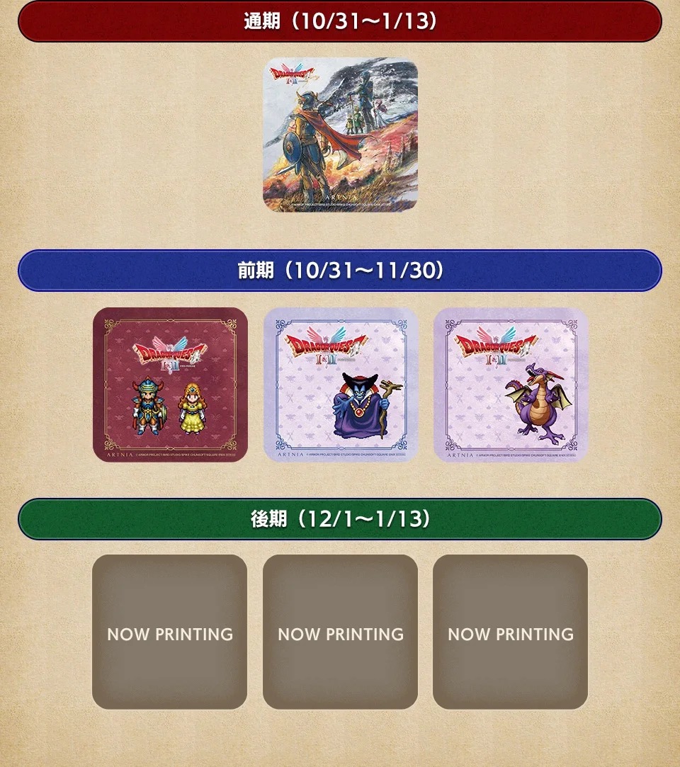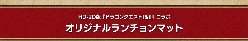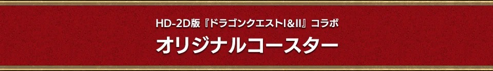 「ドラゴンクエストI & II コラボカフェ in 東新宿/秋葉原」にてコラボフードを1品注文ごとに「オリジナルランチョンマット」の中からランダムで1枚、コラボドリンクを1品注文ごとに「オリジナルコースター」がランダムで1枚プレゼントされる。