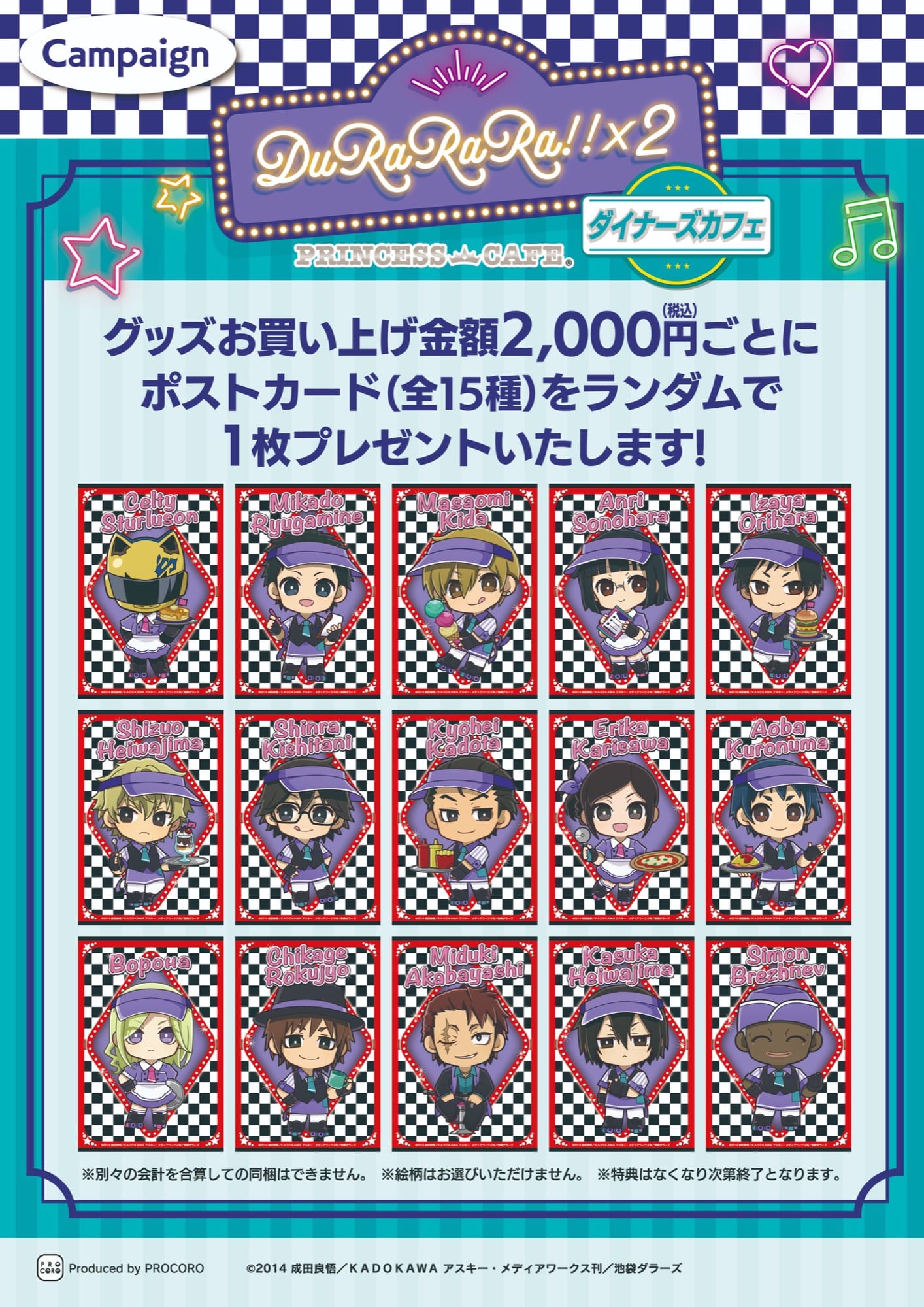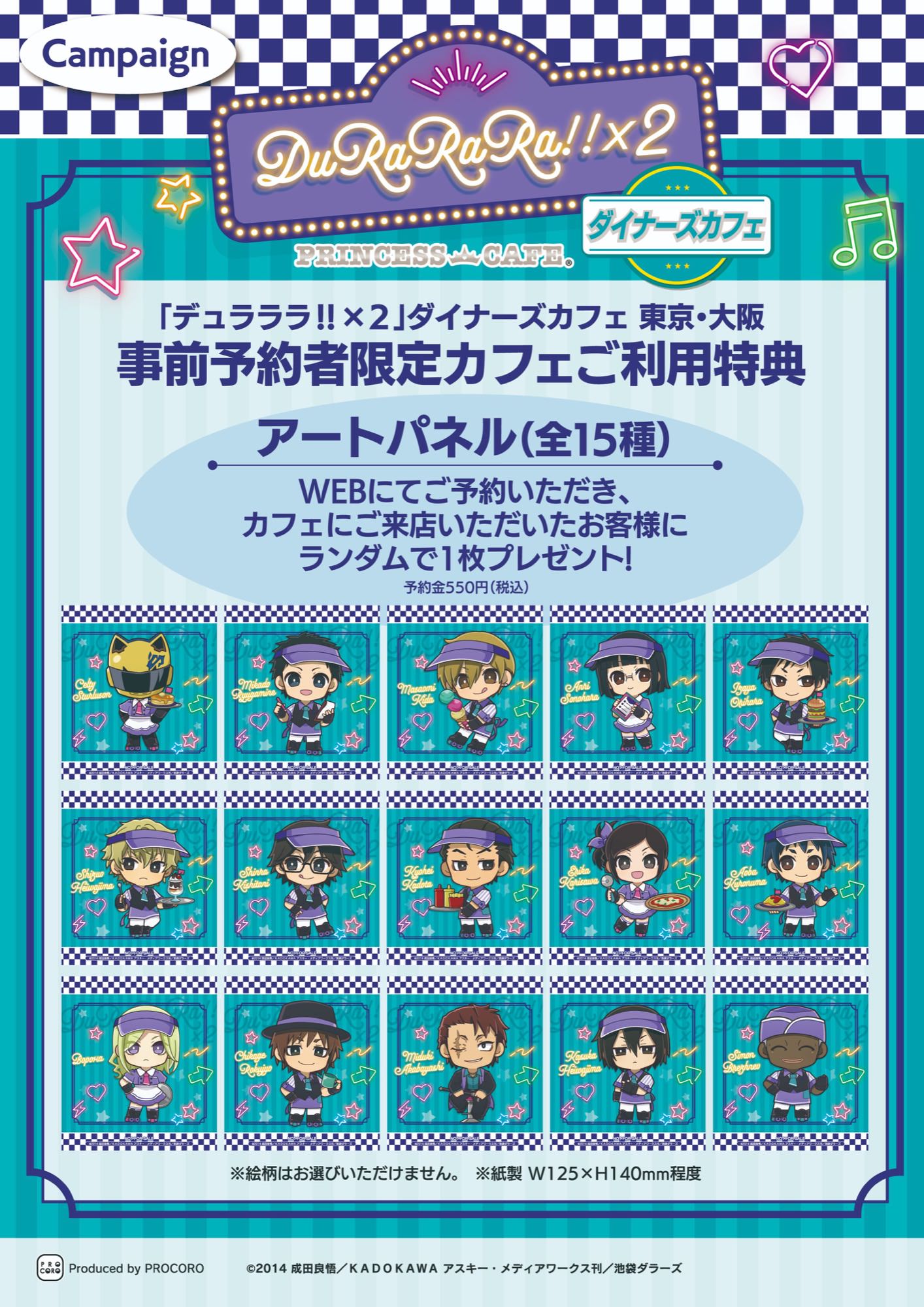 「デュラララ!!×2 × プリンセスカフェ 池袋・梅田」コラボにて、コラボメニューを1品注文するごとに特典として「コースター (全15種)」をランダムに1枚、事前予約のうえカフェを利用すると「アートパネル (全15種)」をランダムに1枚プレゼント!